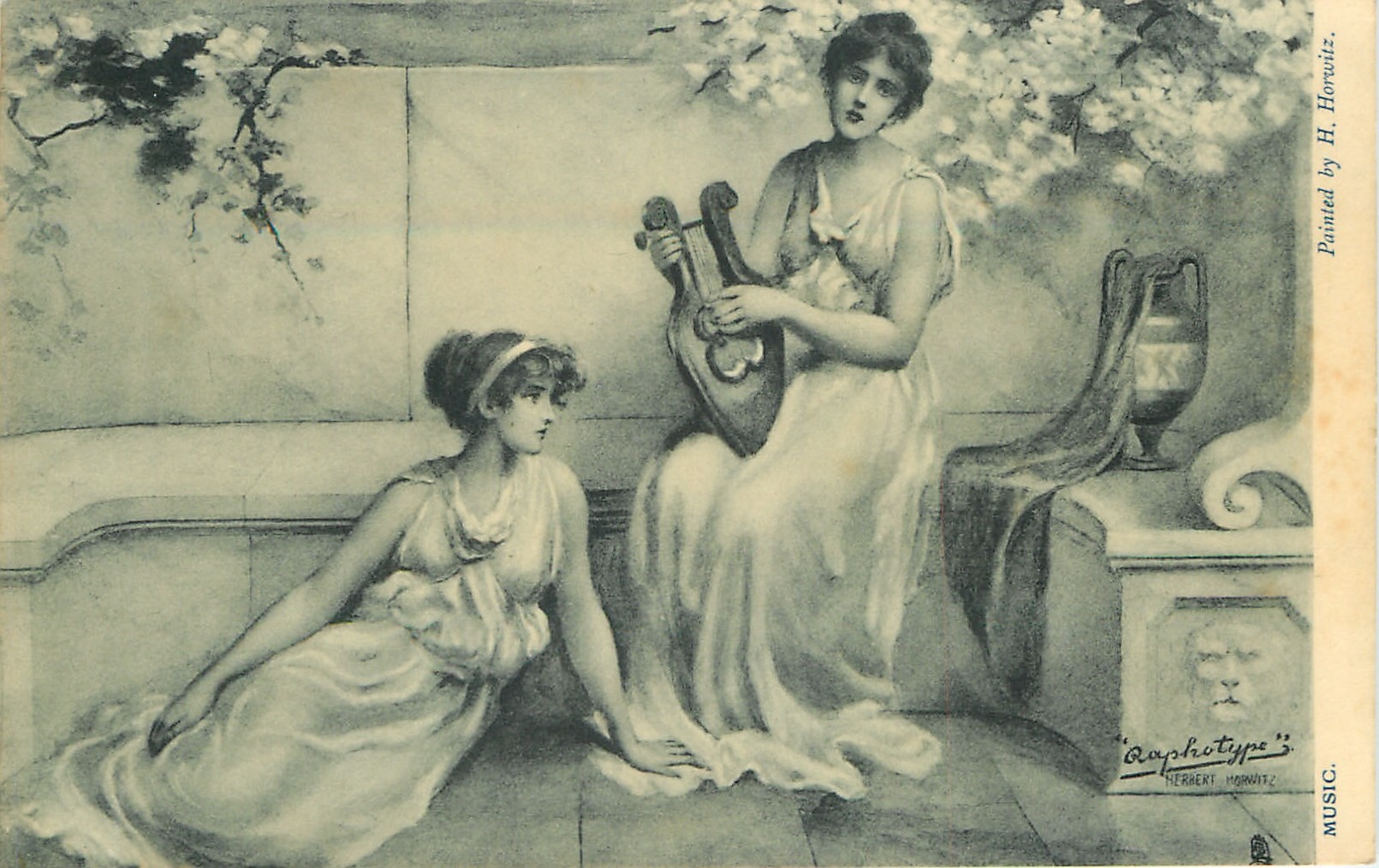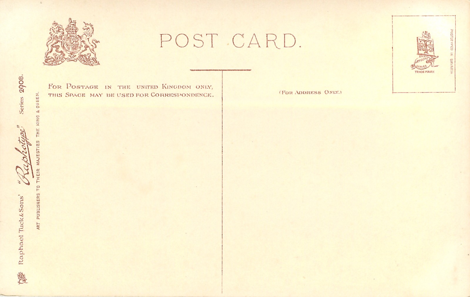 RAPHOTYPE, PHOTOTYPED IN BAVARIA (in stamp box) or PRODUCED IN BAVARIA, card titles & artists come in red or blue, same images 2808, PAINTED BY H. HORWITZ., listed in 1904 POSTCARD Catalogue