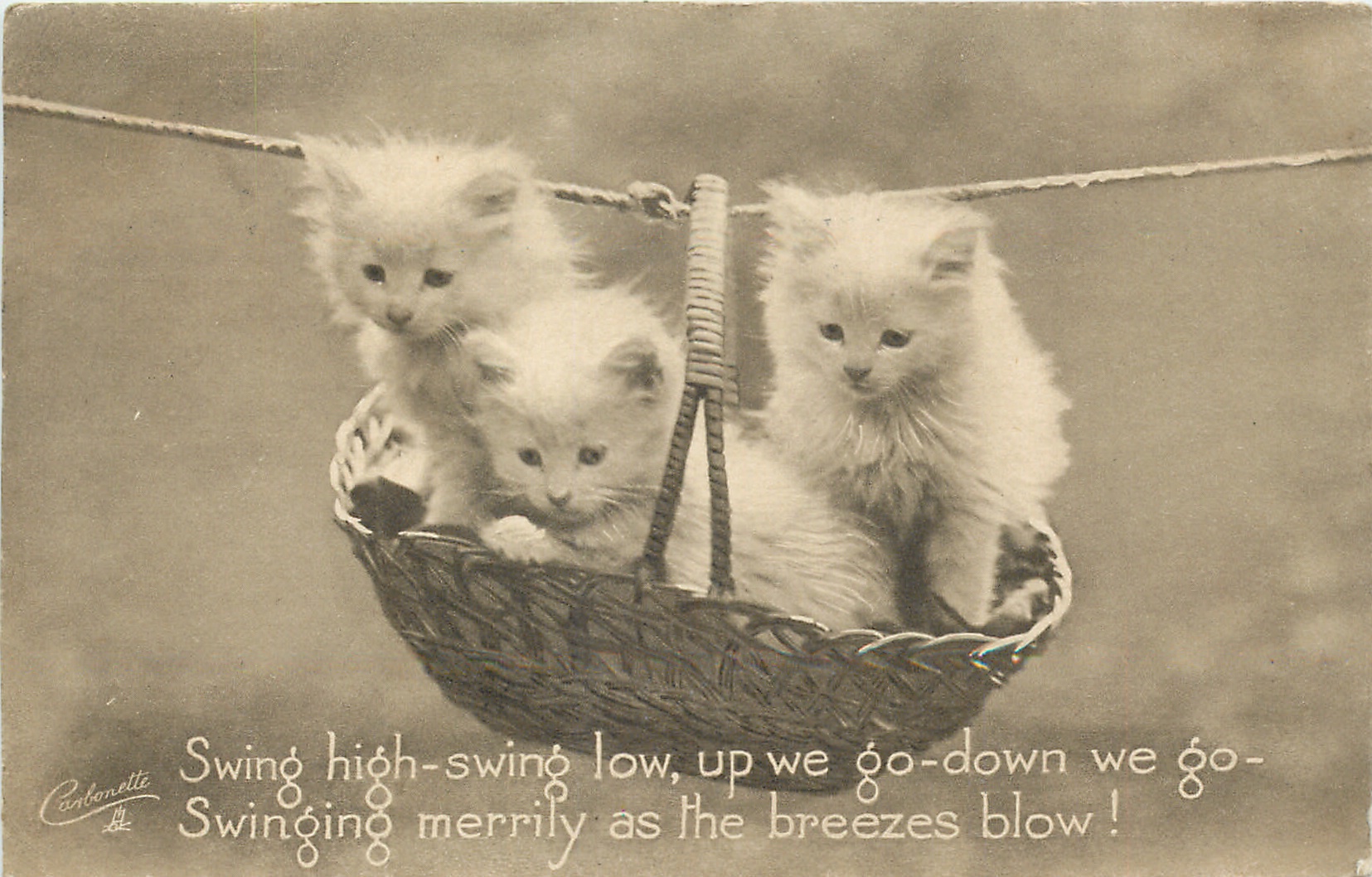 SWING HIGH-SWING LOW.... three kittens swinging in basket hung on a rope, verse below