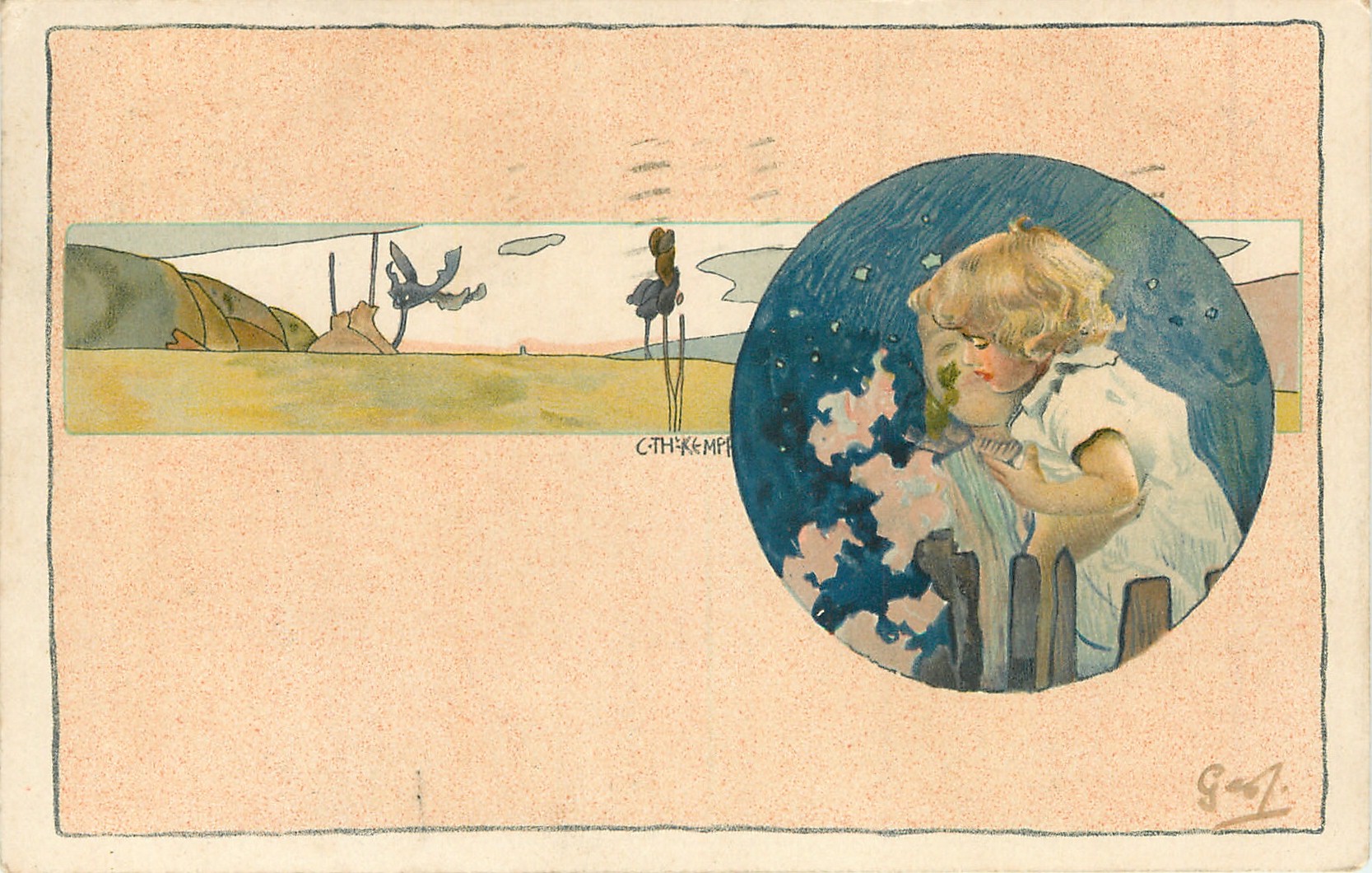 inset of mother & child looking over fence at rose,stylised rural scene behind, buff background
