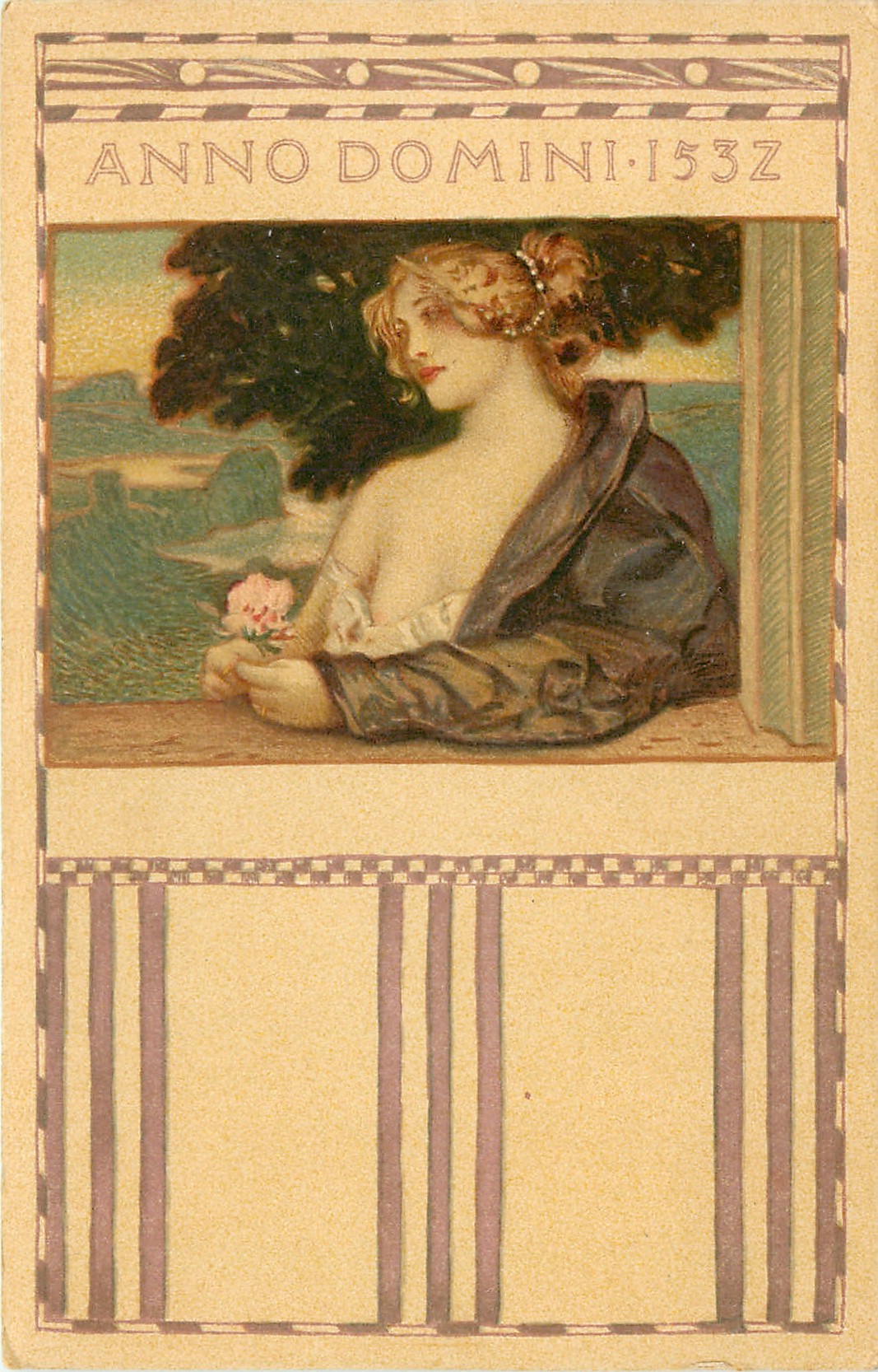 designed panels surround oblong inset of ANNO DOMINI 1532-woman leaning on window sill holds flower, bare right shoulder