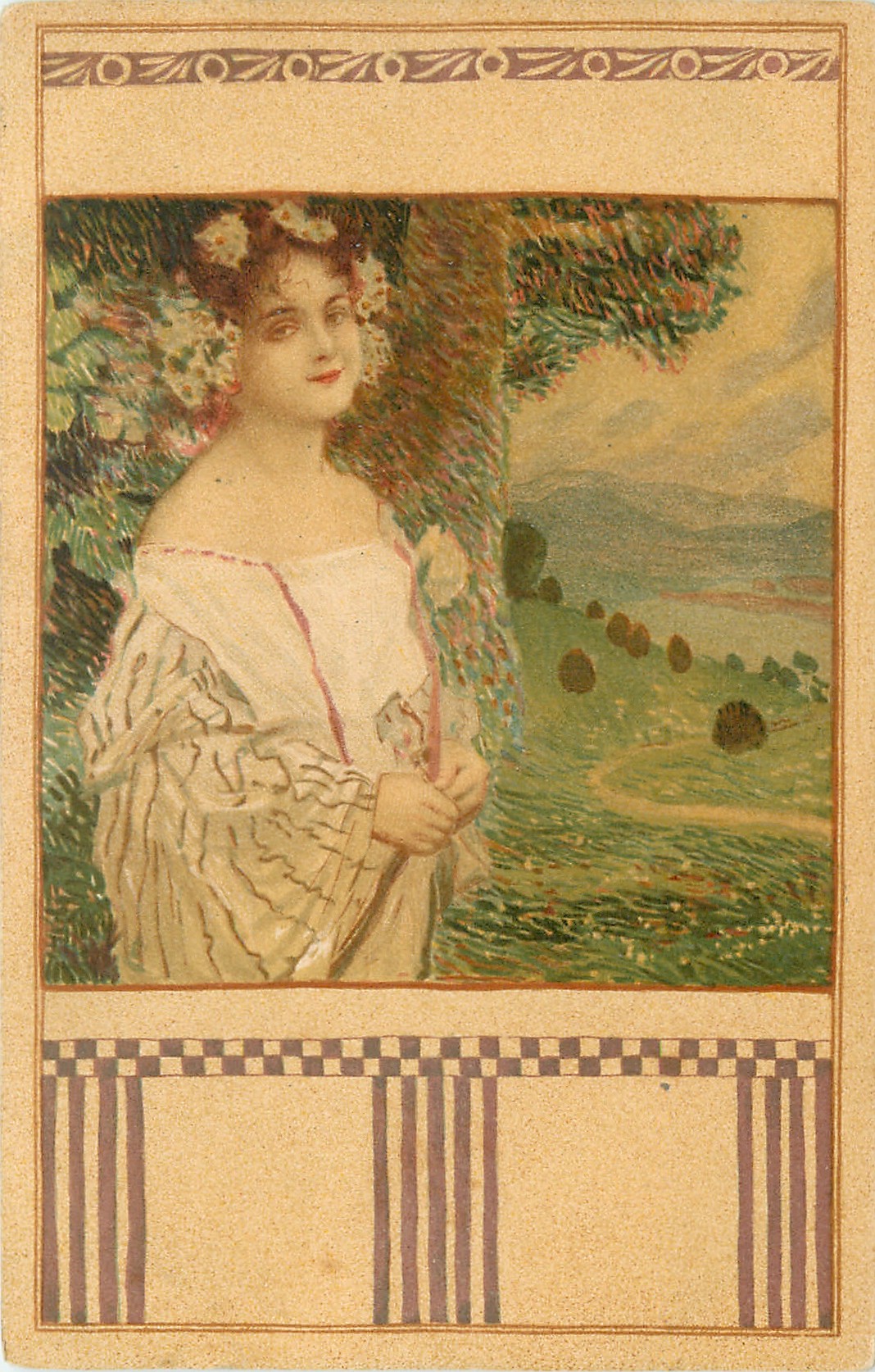designed panels surround oblong inset of woman facing forward right, tree & pastoral scene behind