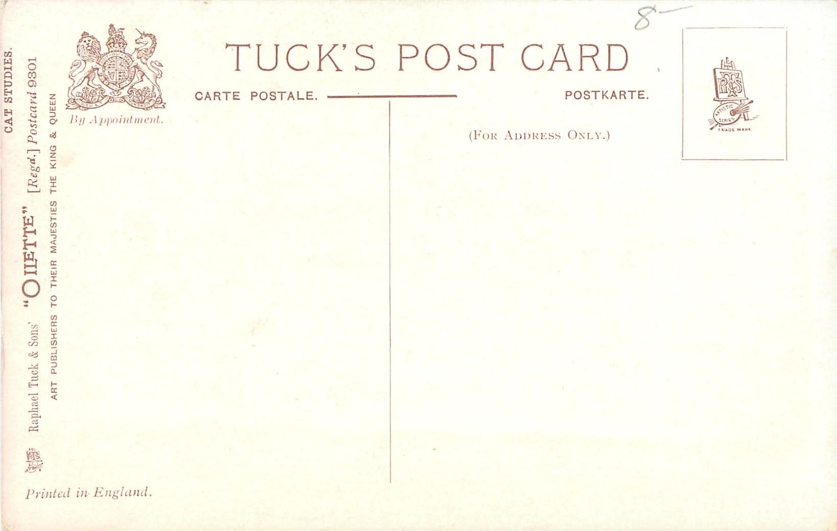 OILETTE, PRINTED IN ENGLAND, listed in 1908/1909 & 1911/1912 & 1912/1913 POSTCARD Catalogue as PUSSY IN FAIRYLAND & as CAT STUDIES