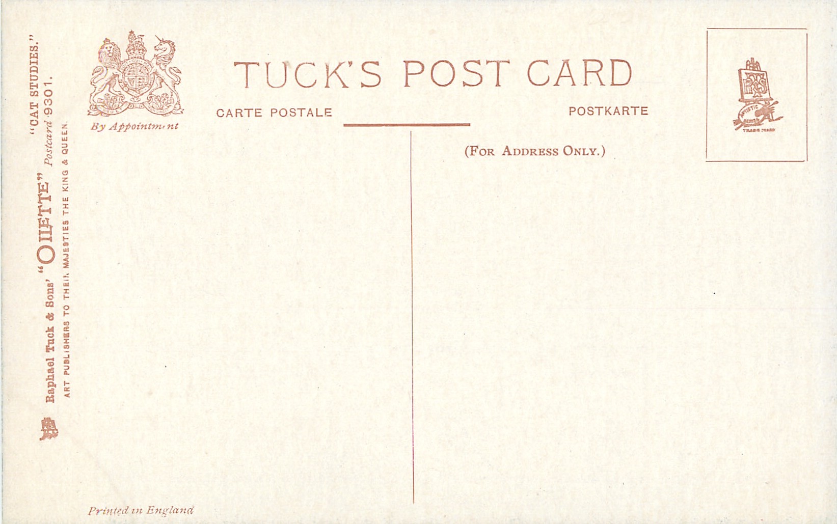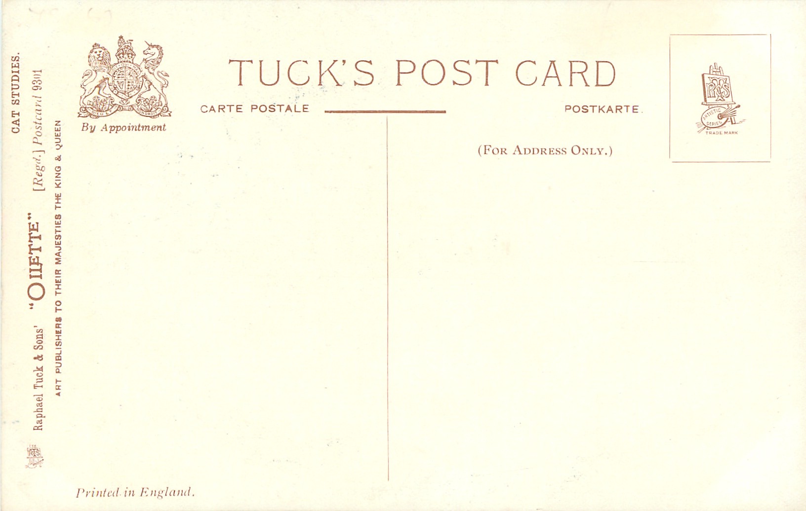 OILETTE, PRINTED IN ENGLAND, listed in 1908/1909 & 1911/1912 & 1912/1913 POSTCARD Catalogue as PUSSY IN FAIRYLAND & as CAT STUDIES