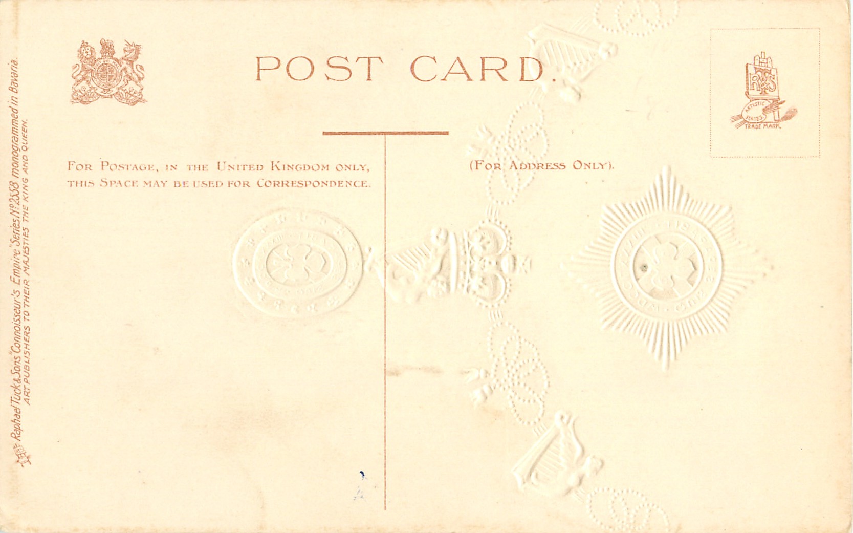 CONNOISSEUR'S EMPIRE, gilt embossed, MONOGRAMMED IN BAVARIA, listed in 1904 POSTCARD Catalogue