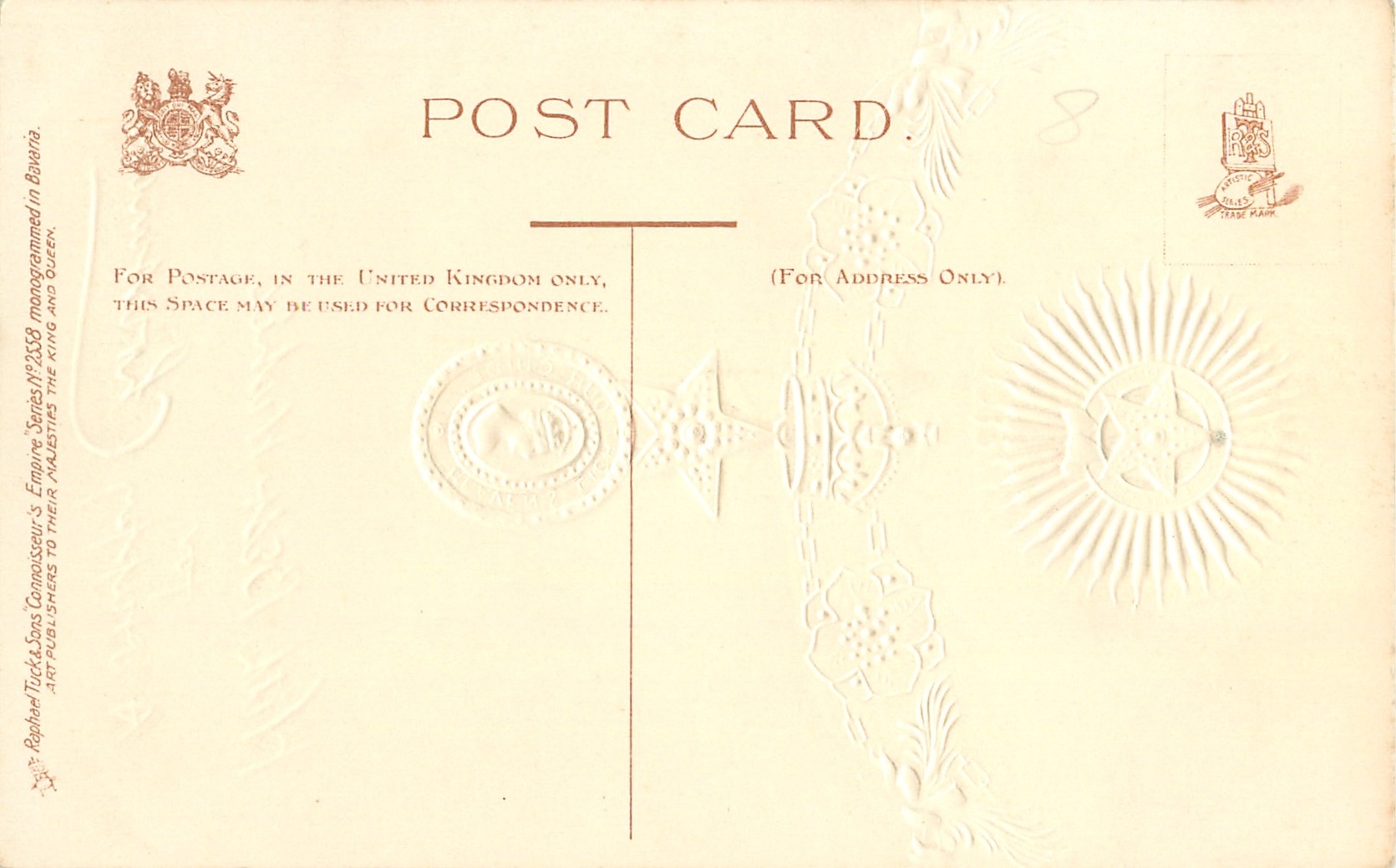 CONNOISSEUR'S EMPIRE, gilt embossed, MONOGRAMMED IN BAVARIA, listed in 1904 POSTCARD Catalogue