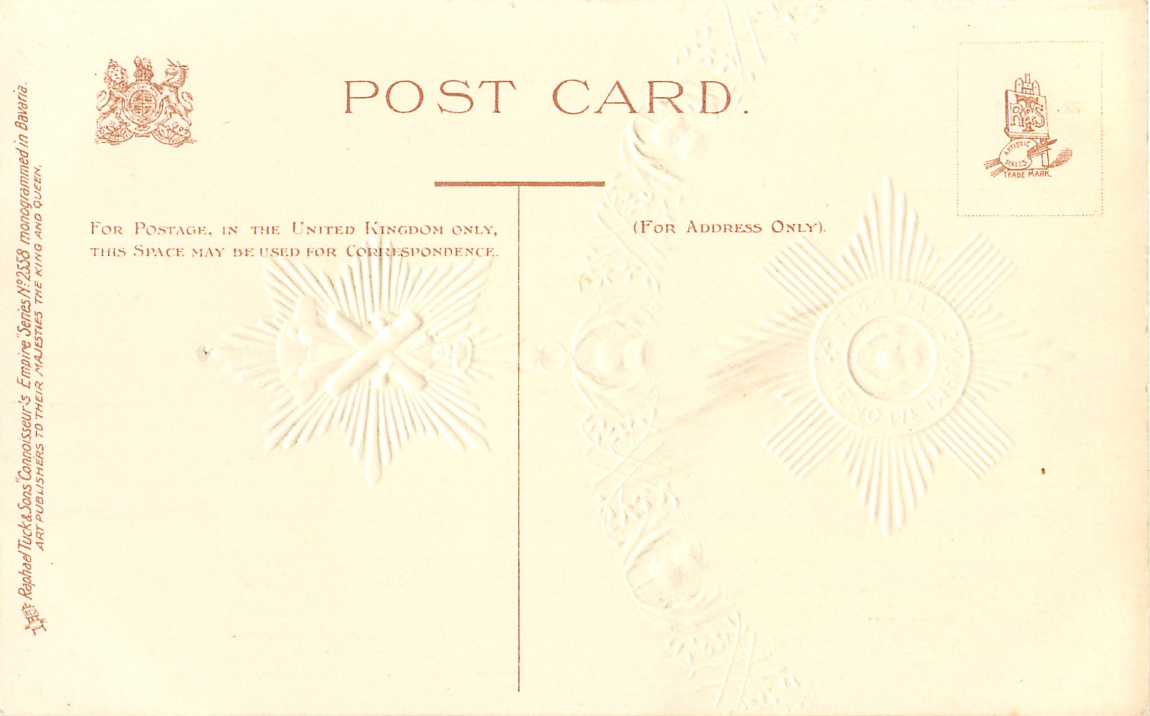 CONNOISSEUR'S EMPIRE, gilt embossed, MONOGRAMMED IN BAVARIA, listed in 1904 POSTCARD Catalogue