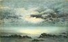 jagged rocks from each side of card & at middle in front of others, no silhouettes of ships on horizon