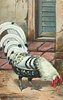 white/black cock with white tail feathers faces right, looking down