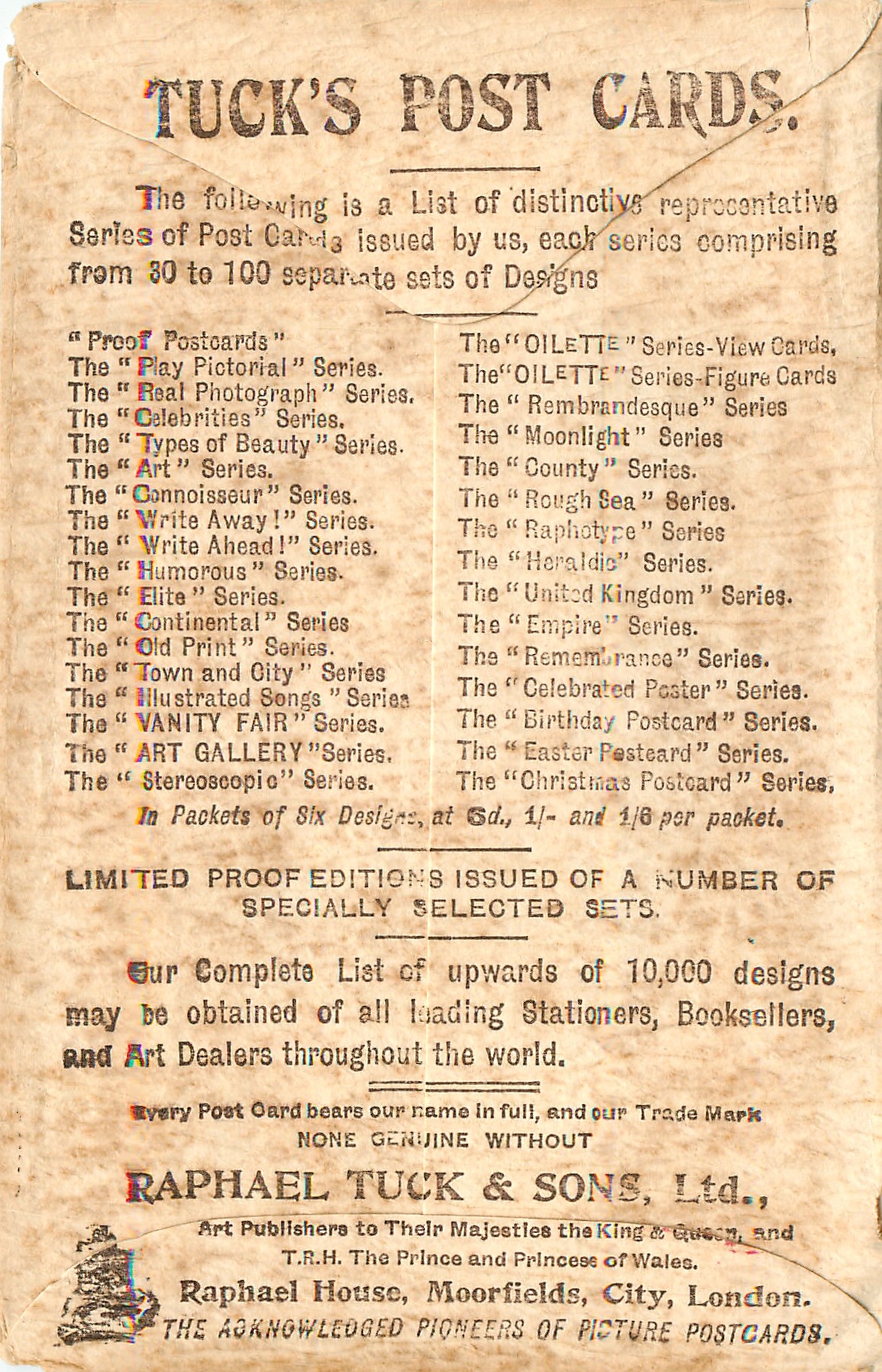 come PRINTED IN ENGLAND, PROOF EDITION (advertised.1902/1903), listed in 1904 & 1908/1909 & 1911/1912 Postcard Catalogues