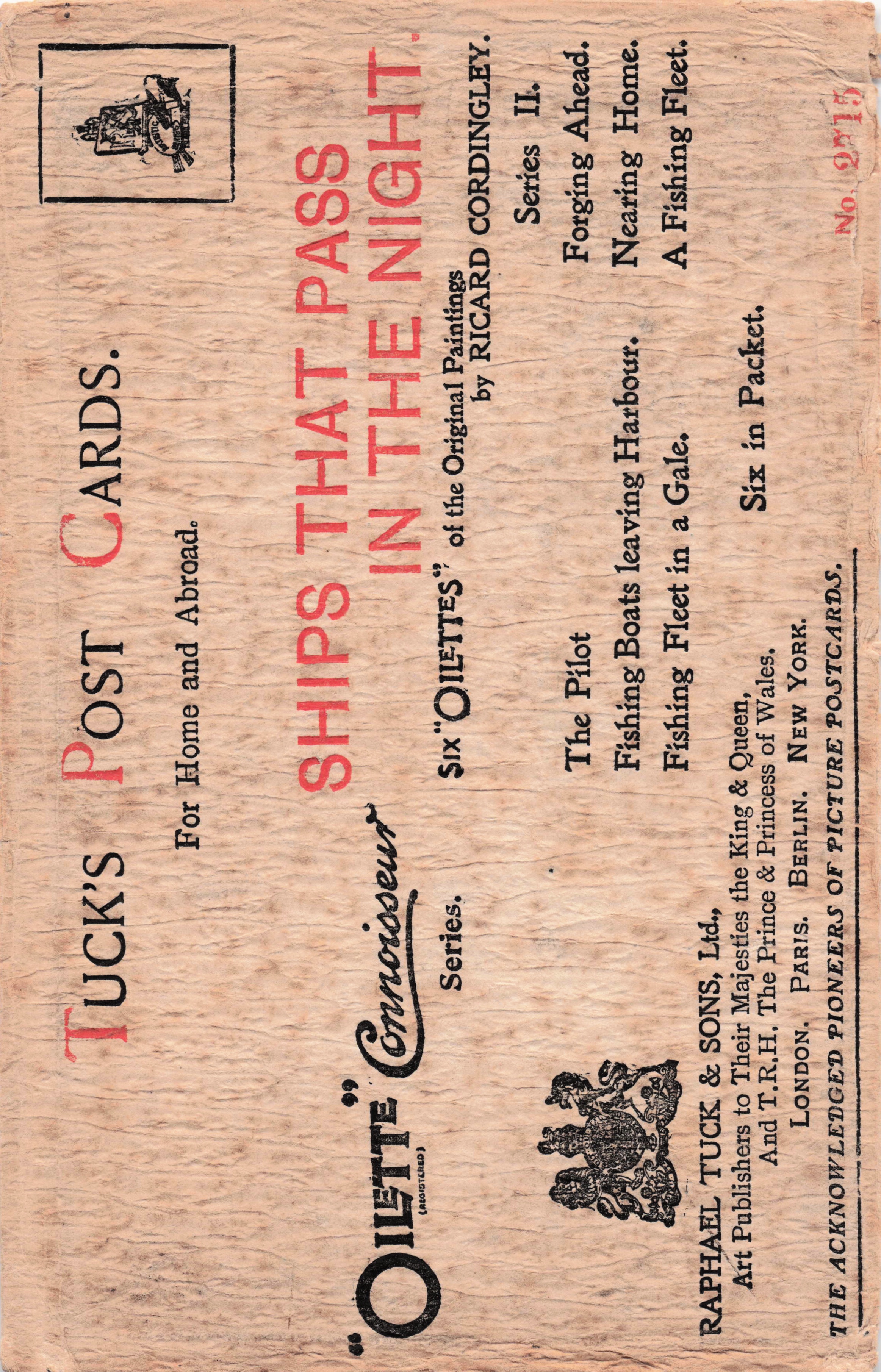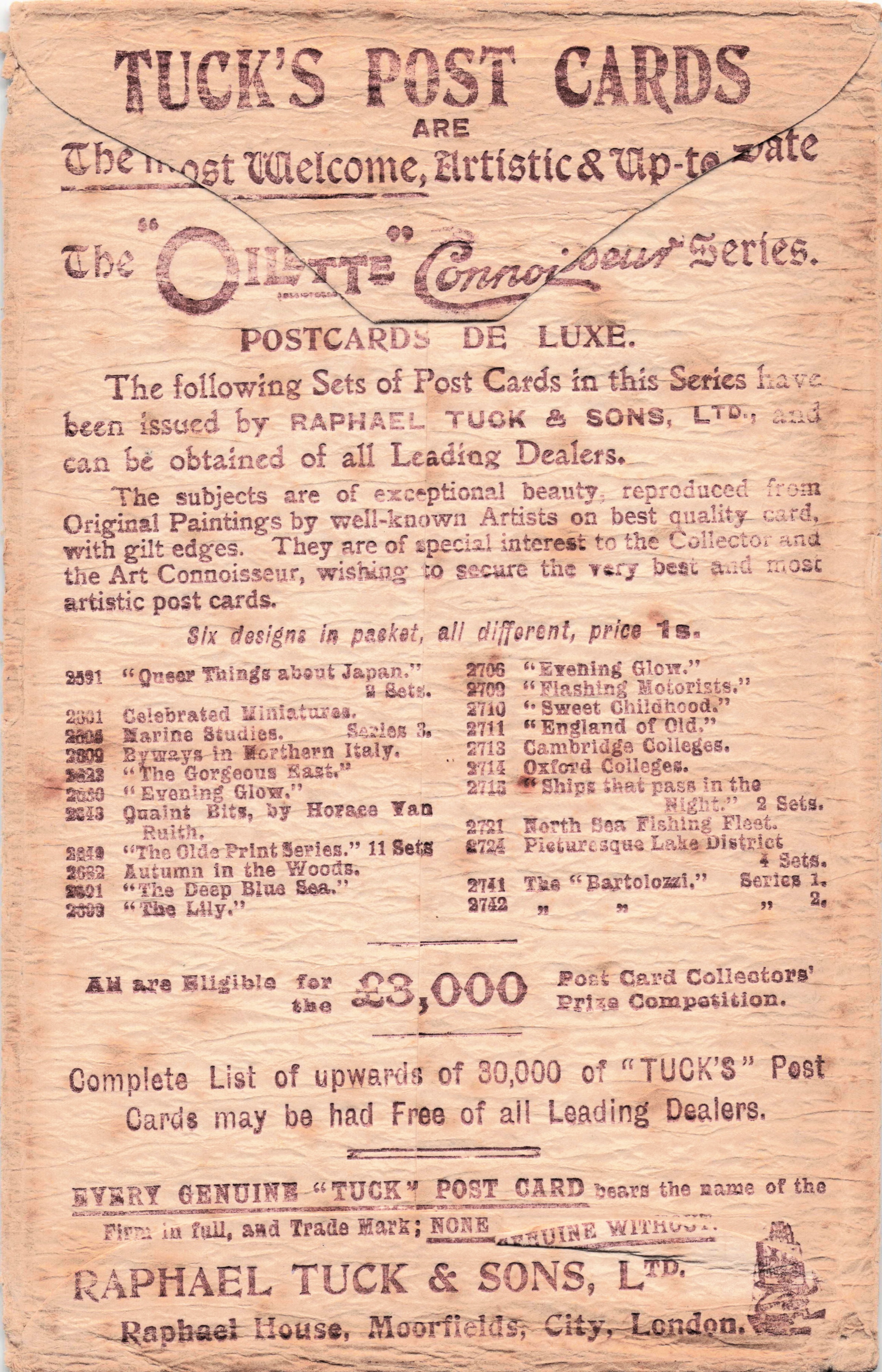 OILETTE CONNOISSEUR, 2 backs, PROCESS BAVARIA (in stamp box) or PROCESS IN BAVARIA (in stamp box), listed in 1908/1909 & 1911/1912 Postcard Catalogue, same images OILETTE 8709, listed in TUCK'S TRAVELOGUES (USA?1905)