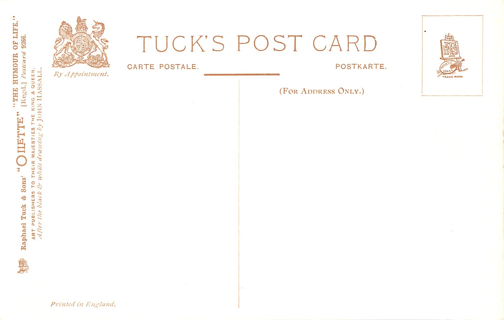 OILETTE, PRINTED IN ENGLAND, FROM THE BLACK & WHITE DRAWINGS OF JOHN HASSALL., listed in 1908/1909 & 1911/1912 PostcardCatalogue