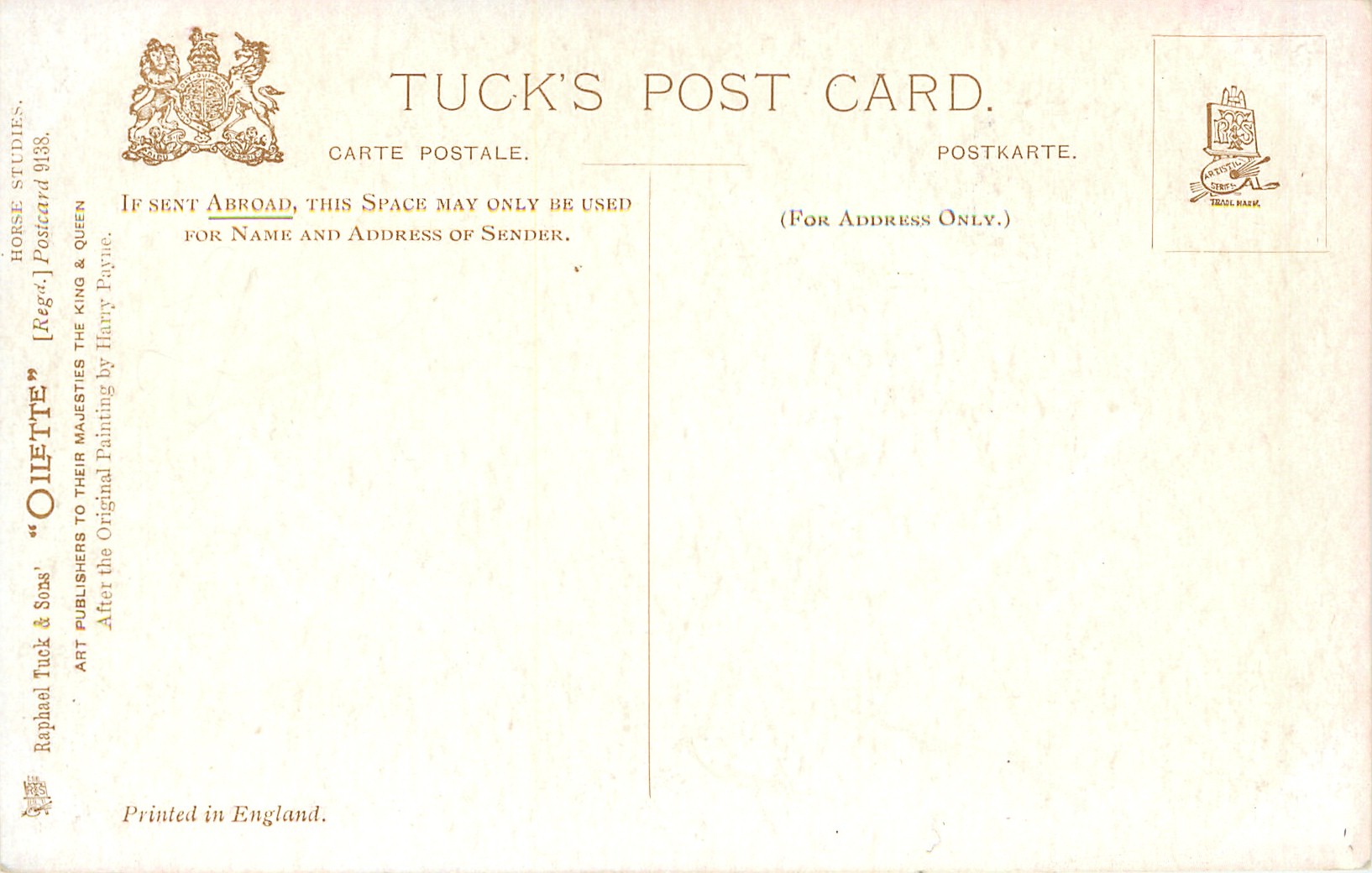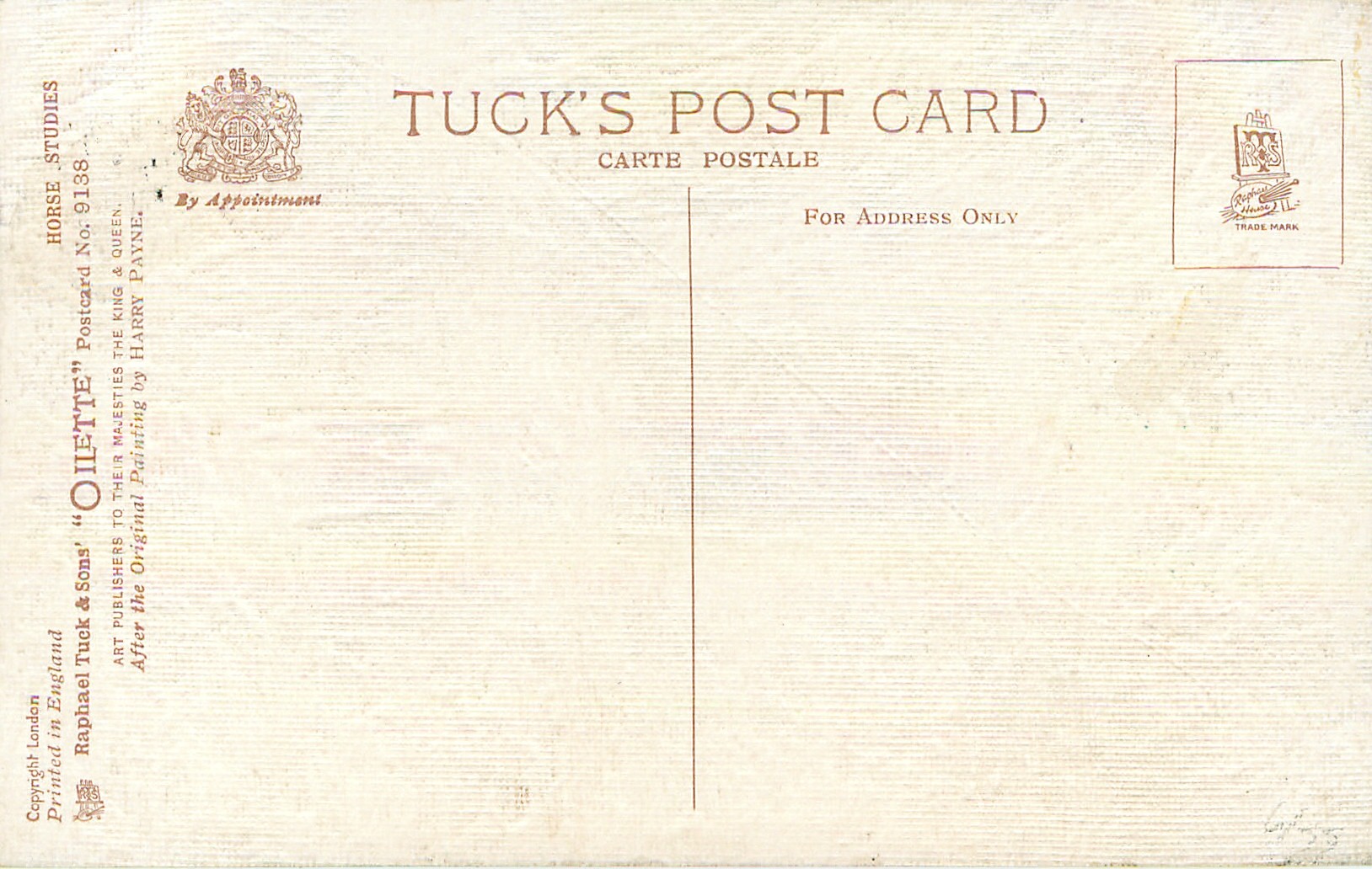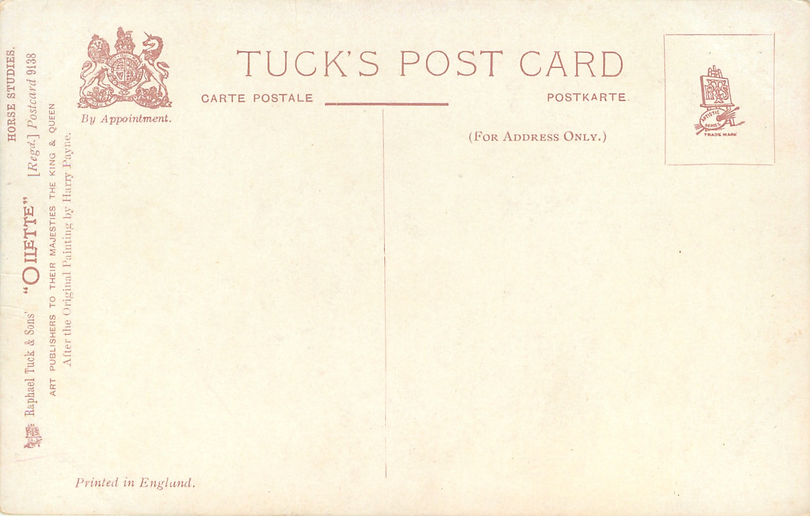 OILETTE, PRINTED IN ENGLAND, COPYRIGHT LONDON, come oilfacsim but not so trade named, come opt.AMEICAN Y.M.C.A., AFTER THE ORIGINAL PAINTING BY HARRY PAYNE, PRINTED IN THE UNITED KINGDOM, listed in1911/1912 & 1912/1913 & 1913/1914 & 1926/1927 & 1930 POSTCARD Catalogues