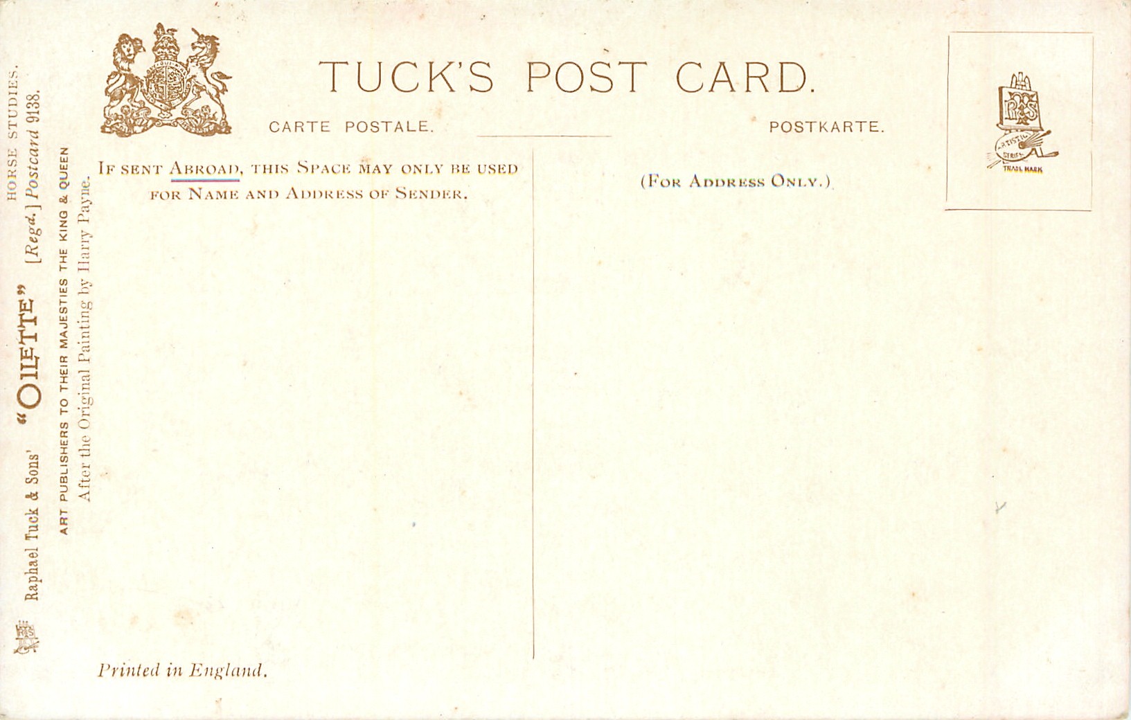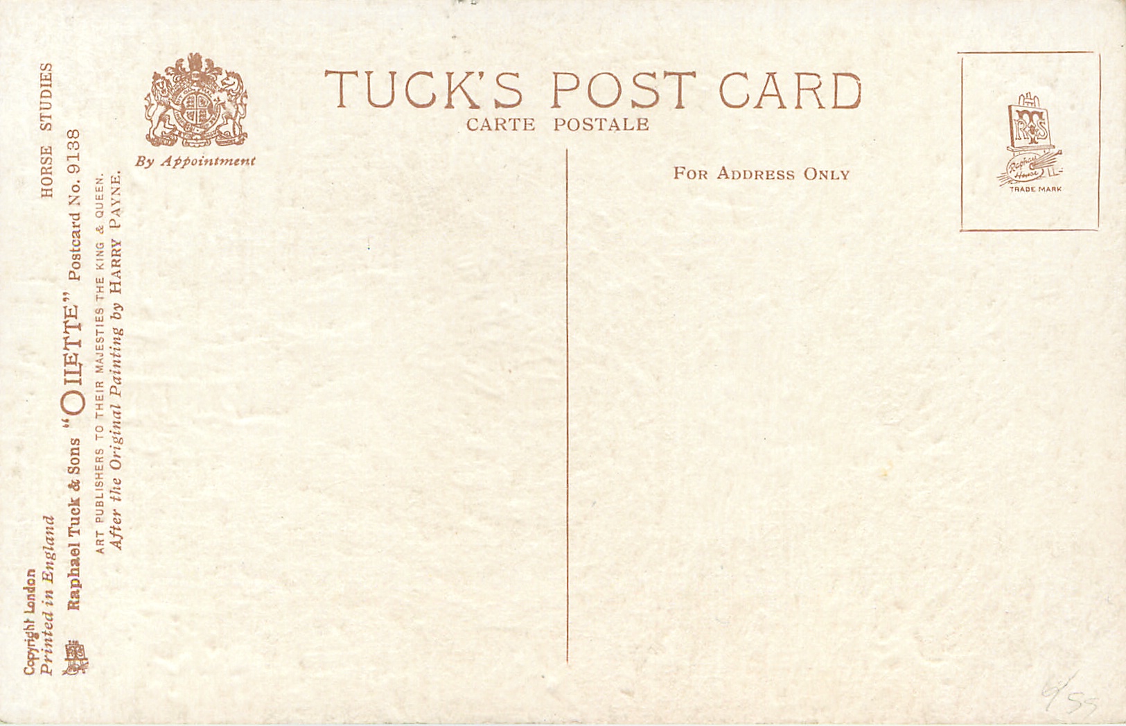 OILETTE, PRINTED IN ENGLAND, COPYRIGHT LONDON, come oilfacsim but not so trade named, come opt.AMEICAN Y.M.C.A., AFTER THE ORIGINAL PAINTING BY HARRY PAYNE, PRINTED IN THE UNITED KINGDOM, listed in1911/1912 & 1912/1913 & 1913/1914 & 1926/1927 & 1930 POSTCARD Catalogues