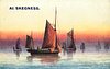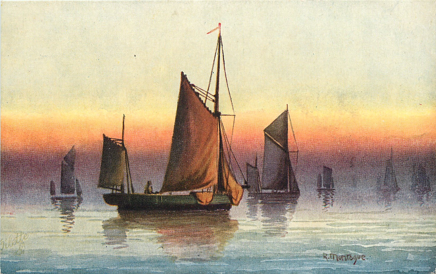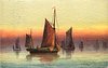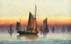 sunset scene, sailboat facing right, two parts of sail hang over boat