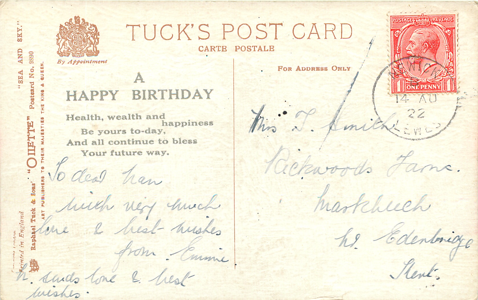 comes opt in blue AT SKEGNESS, in green THE SEASON'S GREETINGS verse, A HAPPY BIRTHDAY verse, FROM WESTCLIFF-ON-SEA, AT DOVER, in blue A KINDLY GREETING FROM BURNHAM-ON-CROUCH