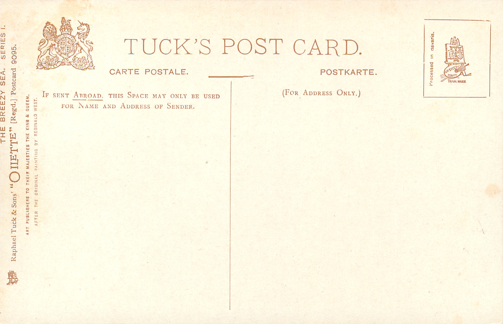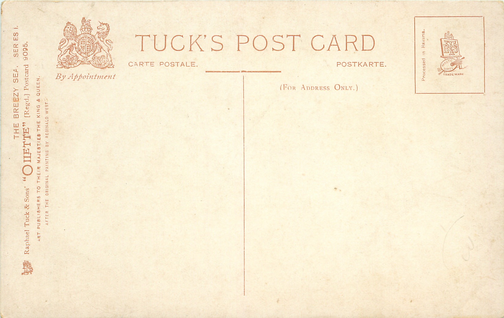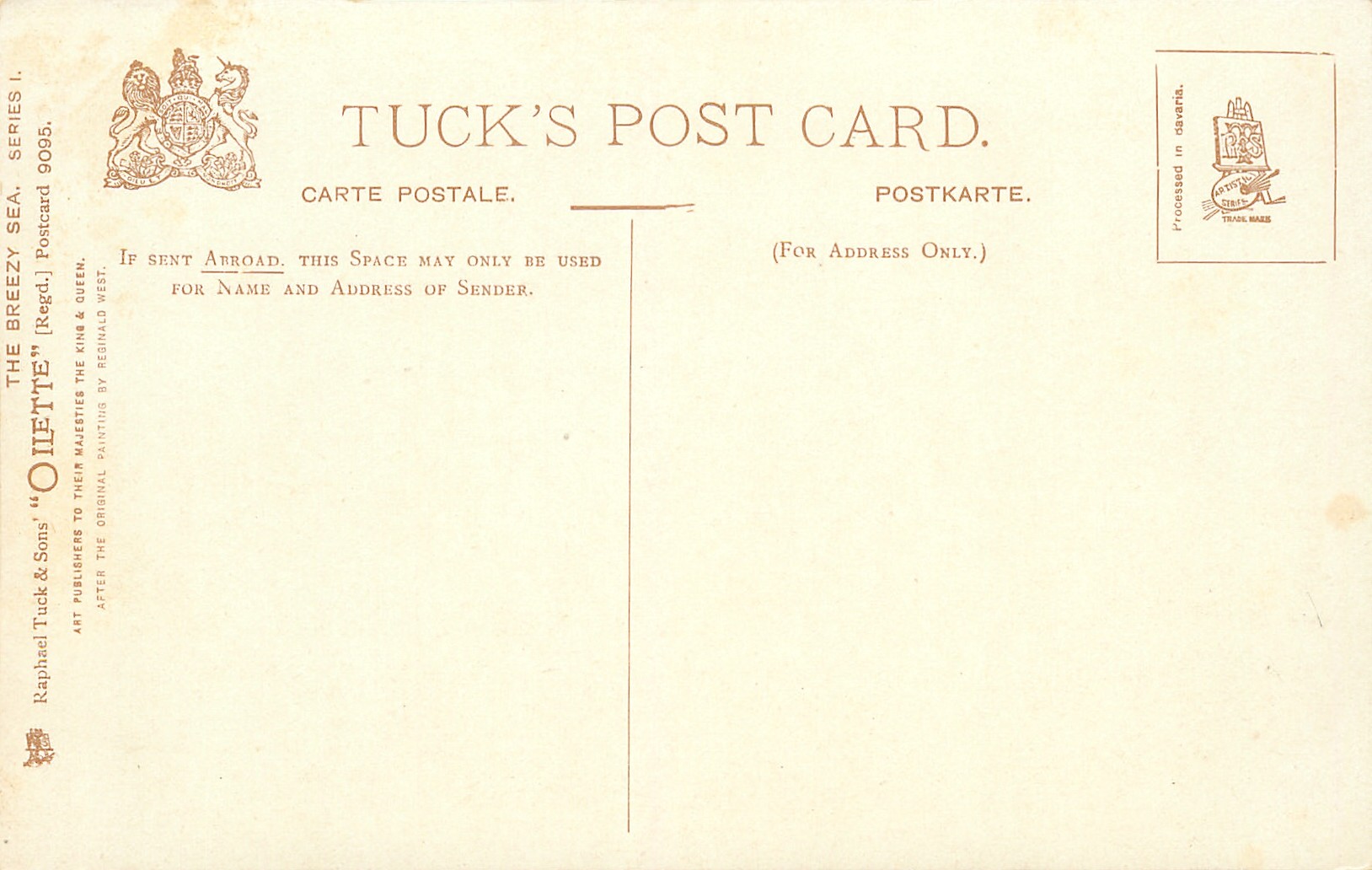 OILETTE, PROCESSED IN BAVARIA (in stamp box), listed in 1908/1909 & 1913/1914 Postcard Catalogue, AFTER THE ORIGINAL PAINTING BY REGINALD WEST., 2 backs, same images German backs OILETTE The Breezy Sea (untitled), with English card titles, come with set title BREZZY SEA (likely typo), listed in TUCK'S TRAVELOGUES (USA?1905)