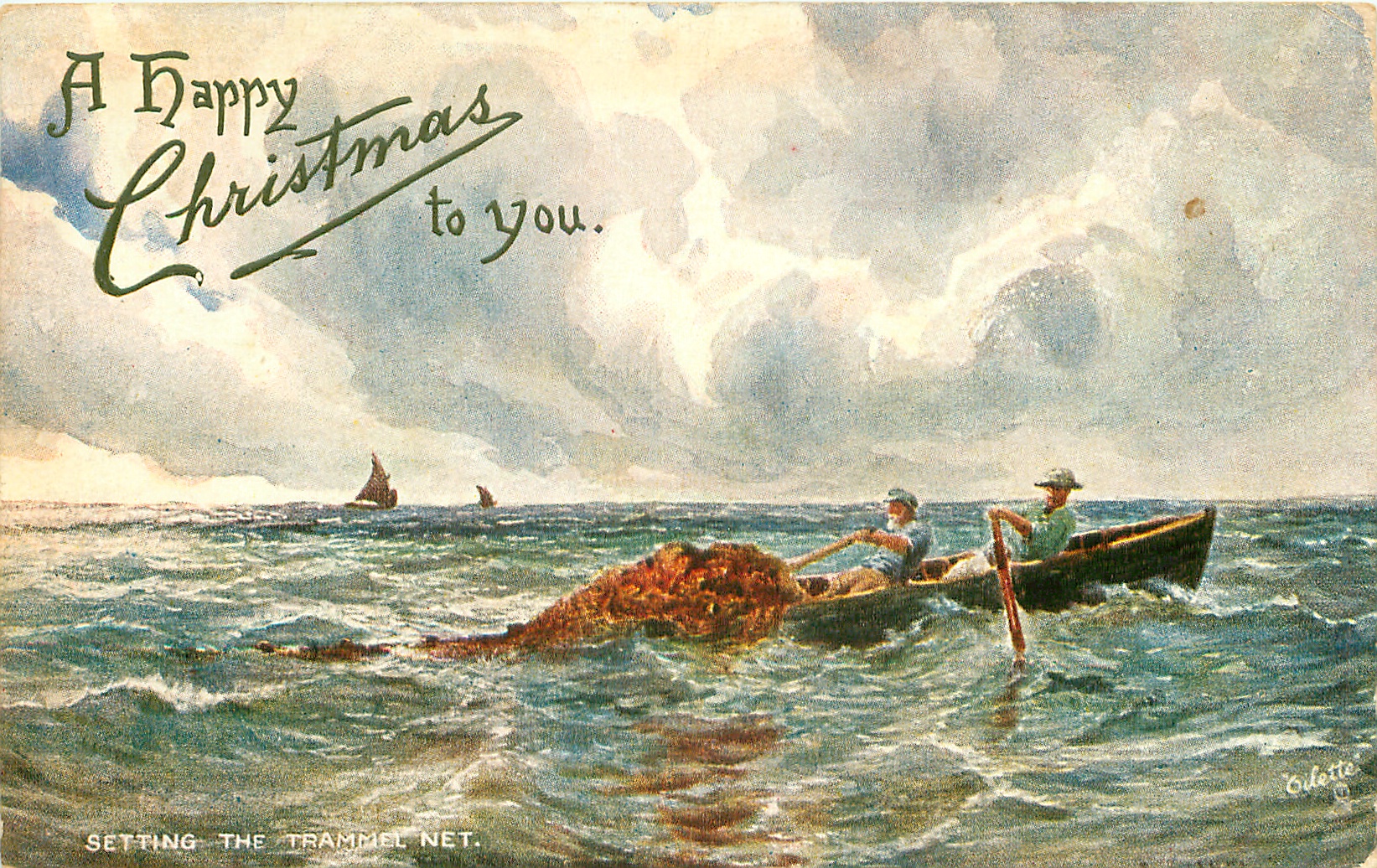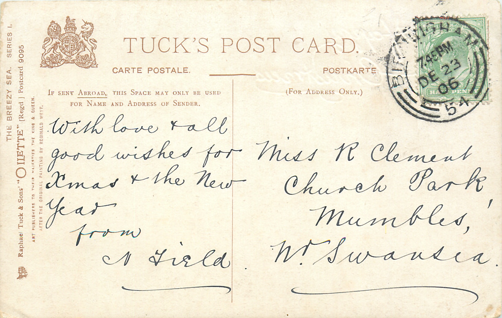 OILETTE, PROCESSED IN BAVARIA (in stamp box), listed in 1908/1909 & 1913/1914 Postcard Catalogue, AFTER THE ORIGINAL PAINTING BY REGINALD WEST., 2 backs, same images German backs OILETTE The Breezy Sea (untitled), with English card titles, come with set title BREZZY SEA (likely typo), listed in TUCK'S TRAVELOGUES (USA?1905)
