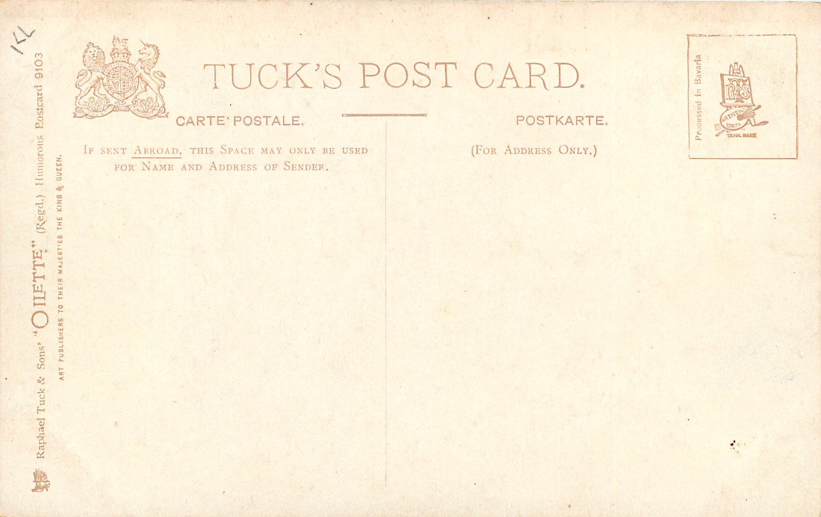 OILETTE, PRINTED IN BAVARIA (in stamp box), LITTLE MARY is the title of 1904 play by Barrie & refers to the stomach
