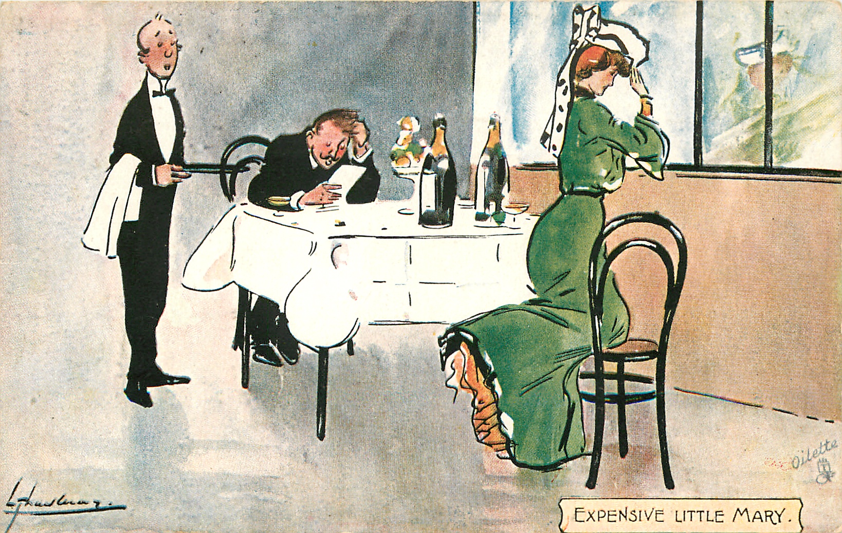 EXPENSIVE LITTLE man unhappy at his bill, woman kneels adjusting her hat