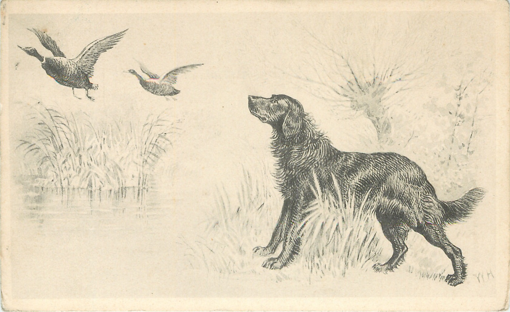 setter in swamp looking at wild ducks fly away