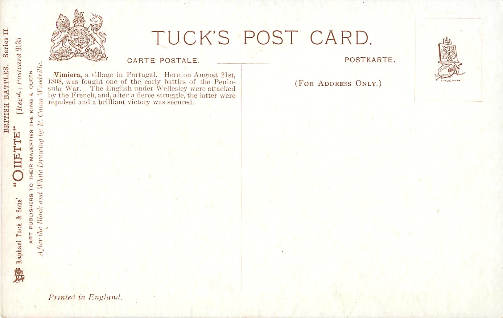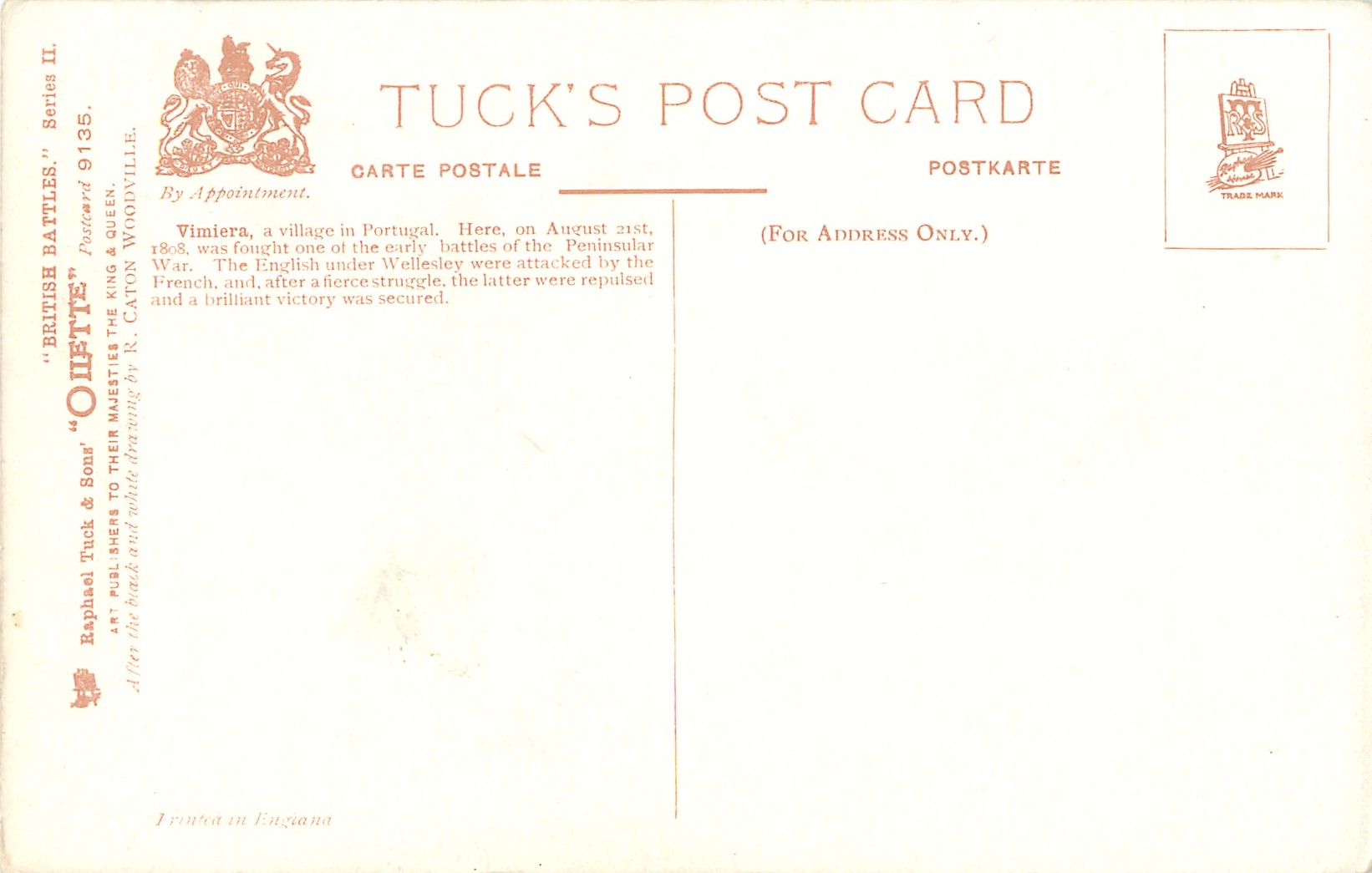 OILETTE, PRINTED IN ENGLAND, AFTER THE BLACK AND WHITE DRAWING BY R. CATON WOODVILLE, listed in 1908/1909 & 1911/1912 & 1913/1914 Postcard Catalogues