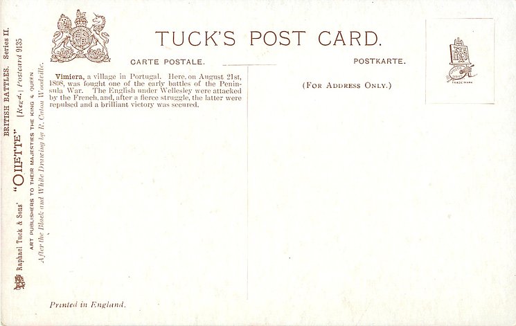 OILETTE, PRINTED IN ENGLAND, AFTER THE BLACK AND WHITE DRAWING BY R. CATON WOODVILLE, listed in 1908/1909 & 1911/1912 & 1913/1914 Postcard Catalogues