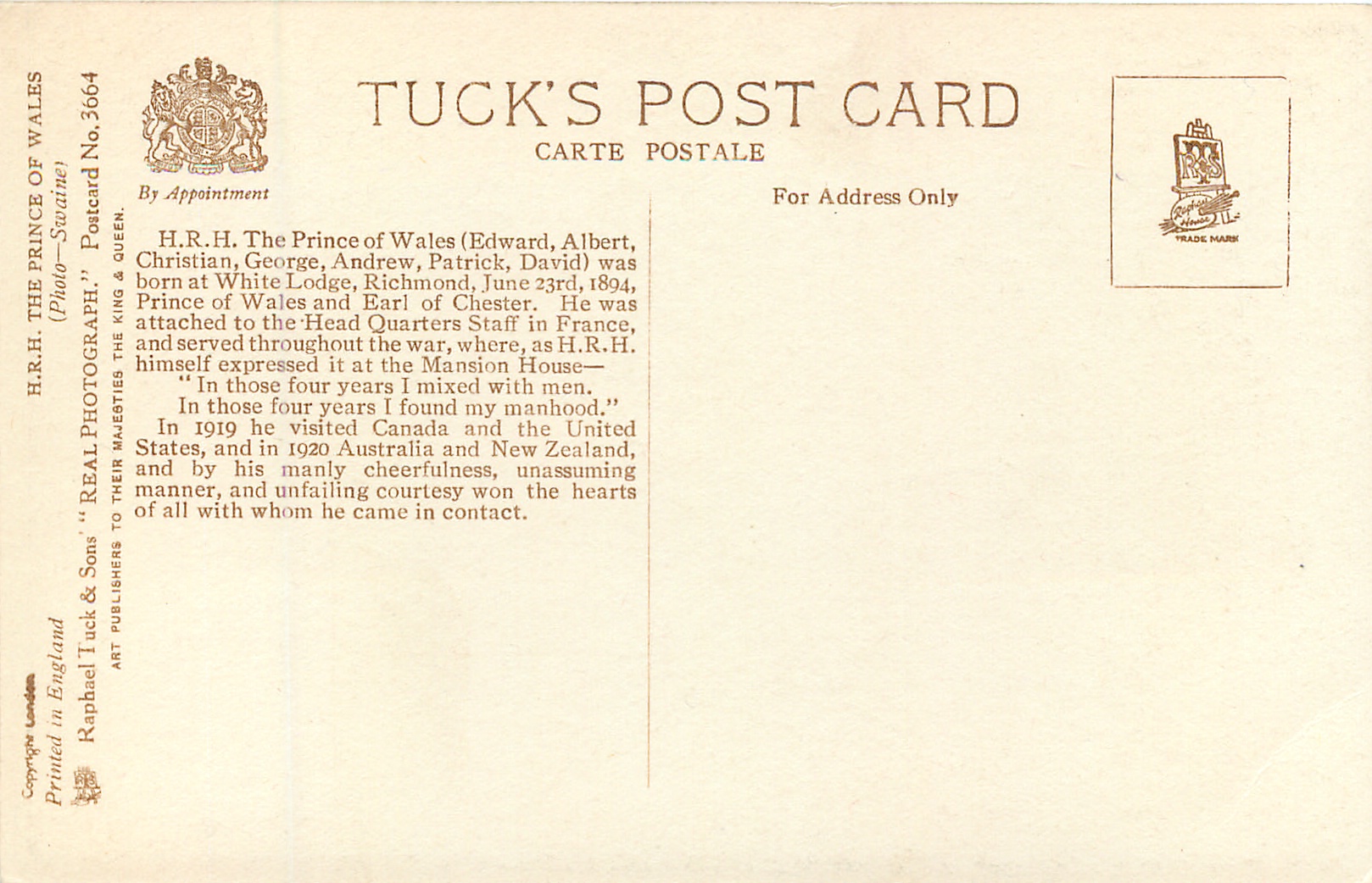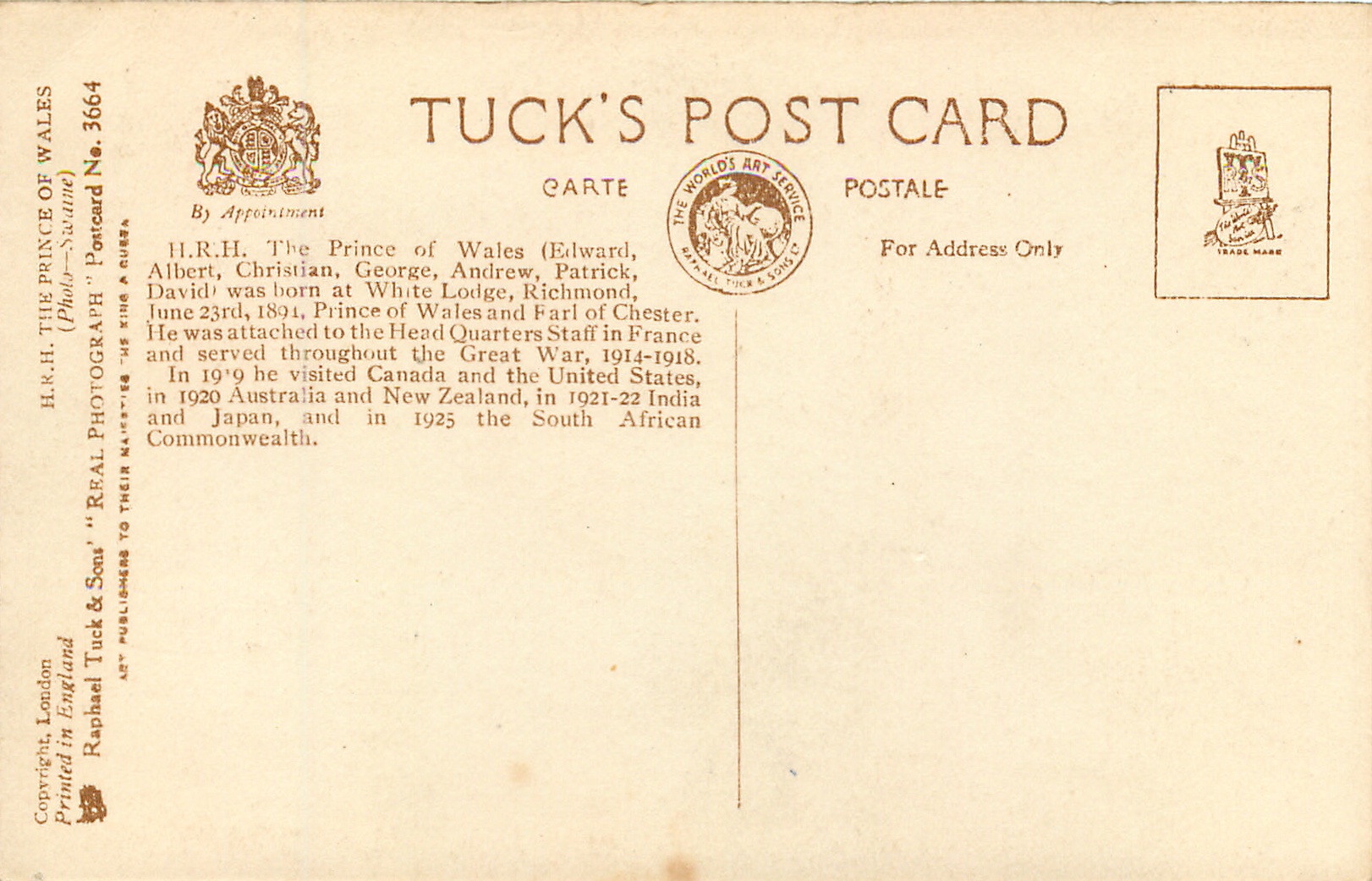 REAL PHOTOGRAPH, PRINTED IN ENGLAND, COPYRIGHT LONDON, same image, larger OILETTE 9888, PHOTO - SWAINE on back, listed in 1930 POSTCARD Catalogue, 2 backs