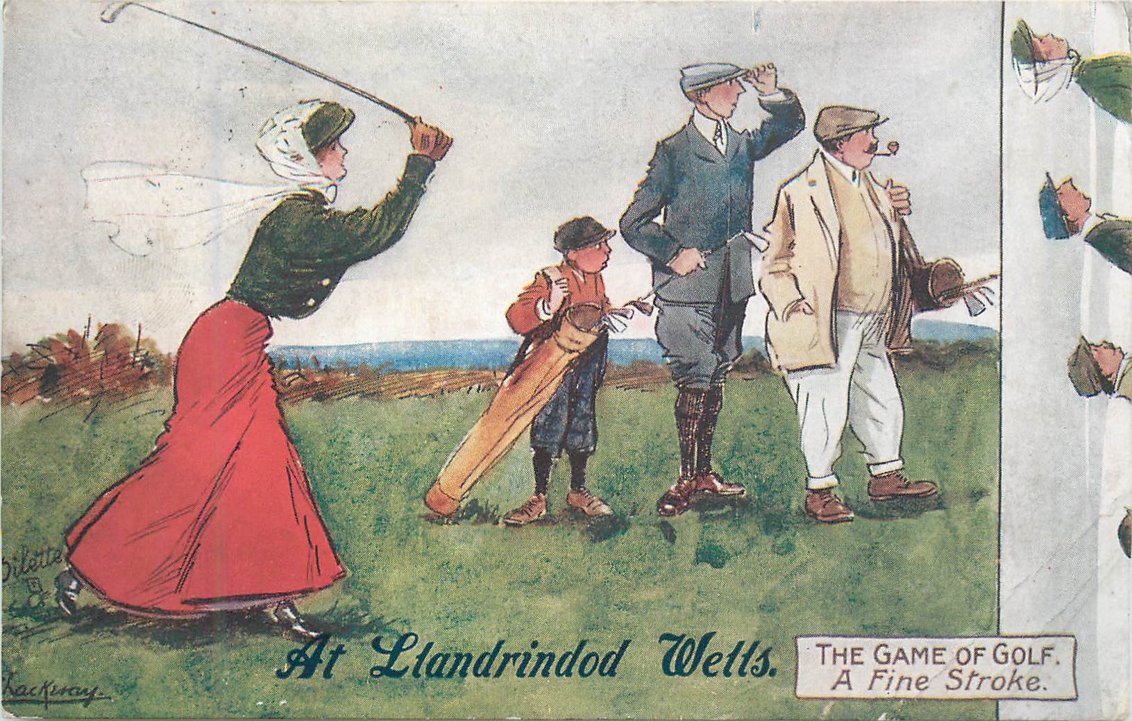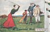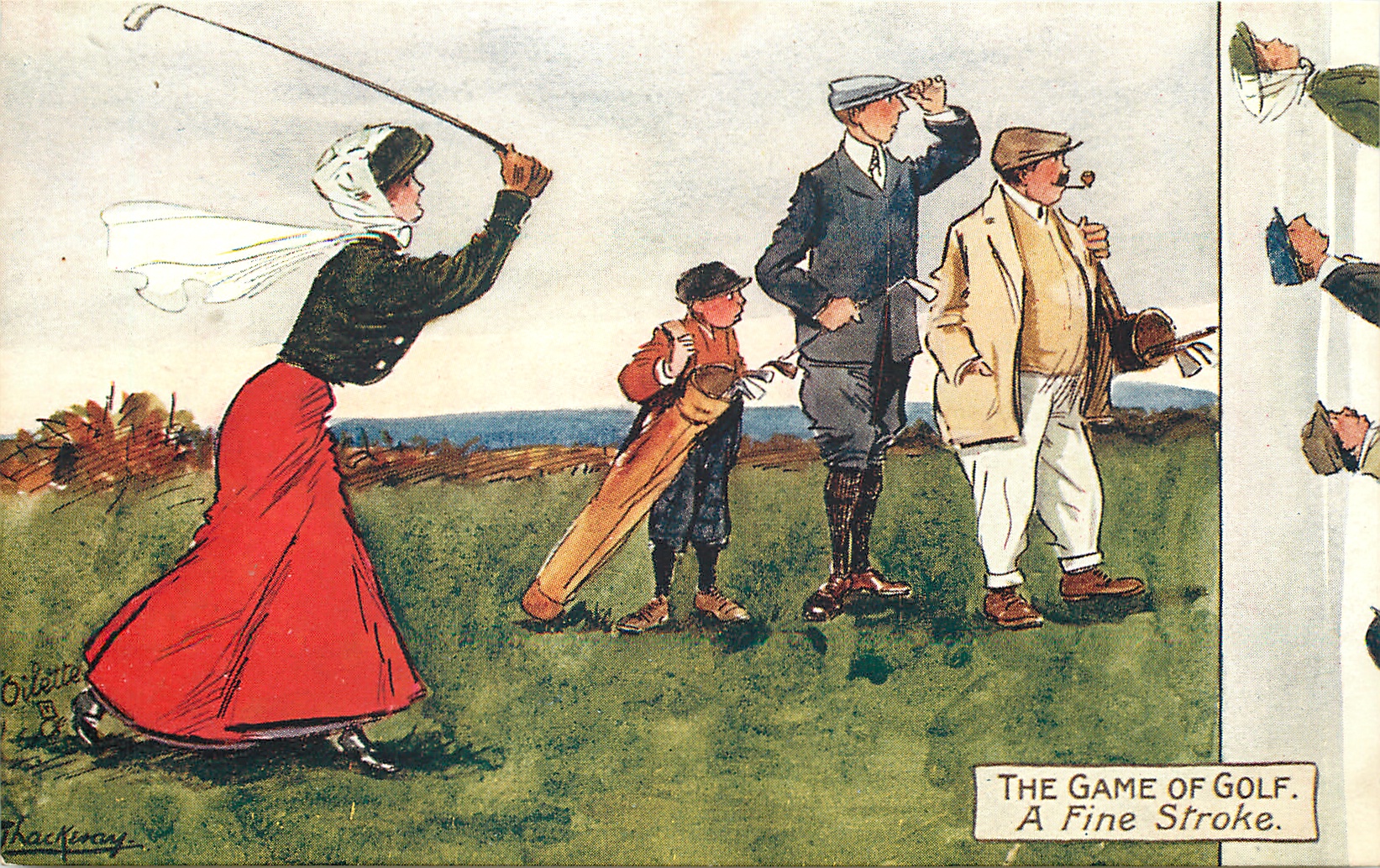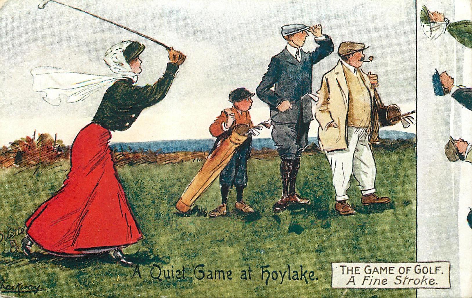 A FINE STROKE lady golfer astonishes male onlookers