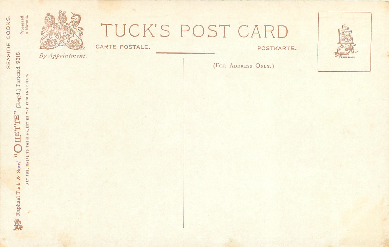 OILETTE, PROCESSED IN BAVARIA (in or out of stamp box), listed in 1908/1909 & 1911/1912 Postcard Catalogue, same images OILETTE 9968