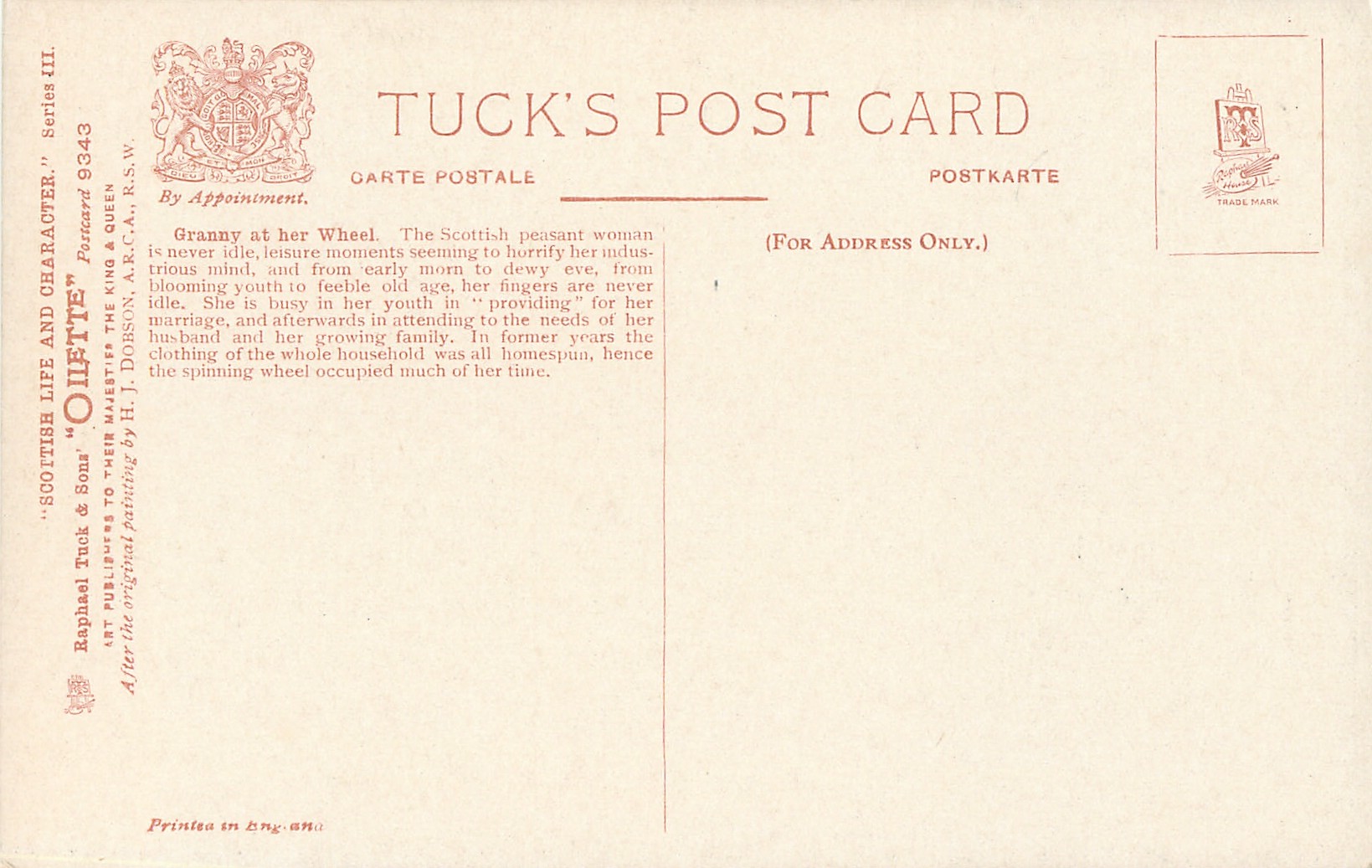 OILETTE, PRINTED IN ENGLAND, with or w/o COPYRIGHT LONDON, AFTER THE ORIGINAL PAINTING BY H.J. DOBSON, A.R.C.A., R.S.W., listed in 1908/1909 & 1911/1912 & 1913/1914 &1930 POSTCARD Catalogues, listed in TUCK'S TRAVELOGUES (USA?1905)