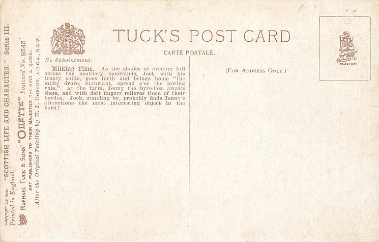 OILETTE, PRINTED IN ENGLAND, with or w/o COPYRIGHT LONDON, AFTER THE ORIGINAL PAINTING BY H.J. DOBSON, A.R.C.A., R.S.W., listed in 1908/1909 & 1911/1912 & 1913/1914 &1930 POSTCARD Catalogues, listed in TUCK'S TRAVELOGUES (USA?1905)