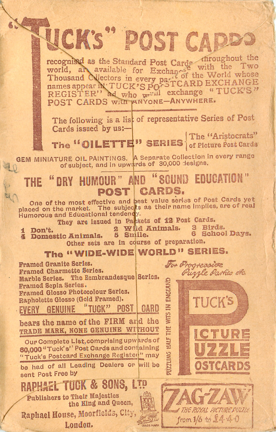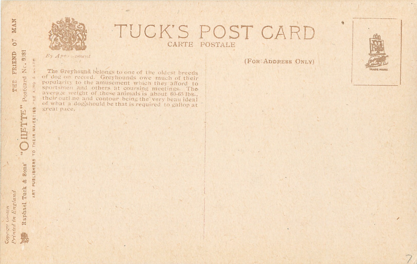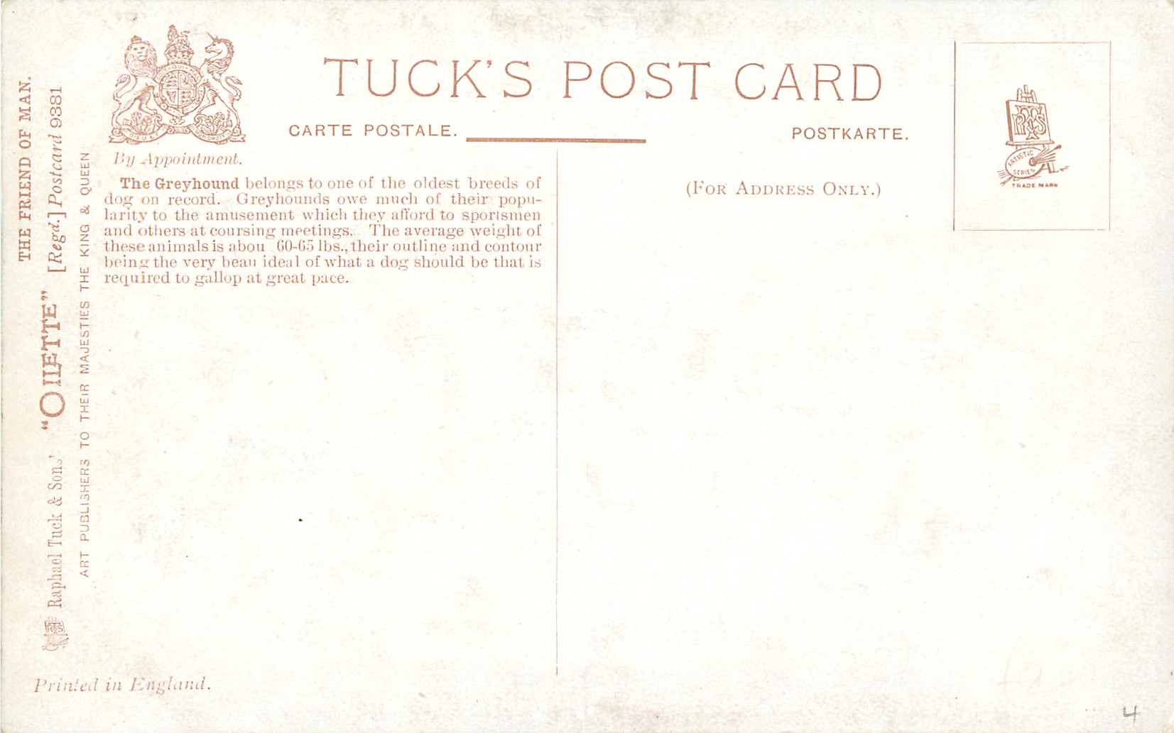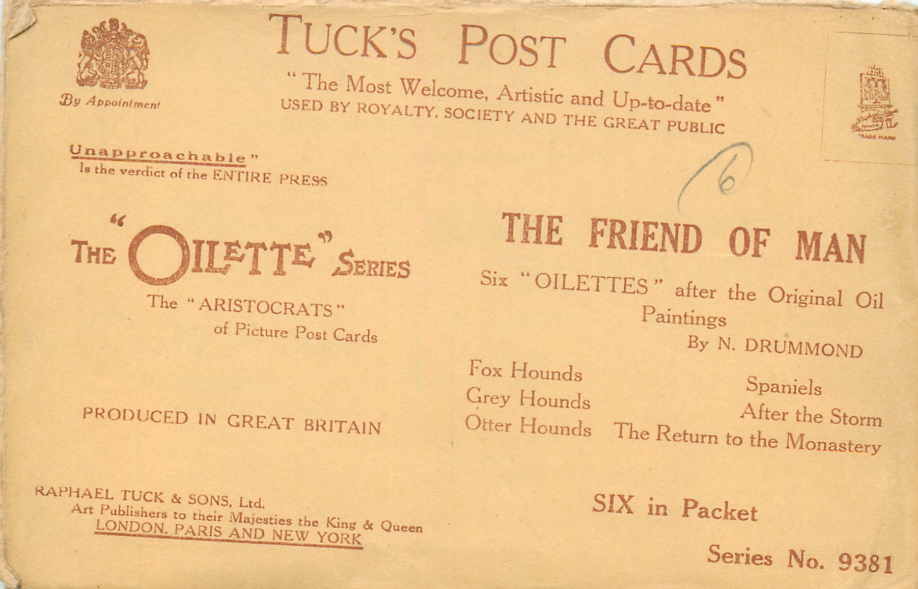 OILETTE, come Oilfacsim but not so trade-named, PRINTED IN ENGLAND, with or w/o COPYRIGHT LONDON, , listed in 1930 Postcard Catalogue & 1932 ART SERVICE Catalogue, some of same images OILETTE 3046, listed in 1908/1909 Catalogue