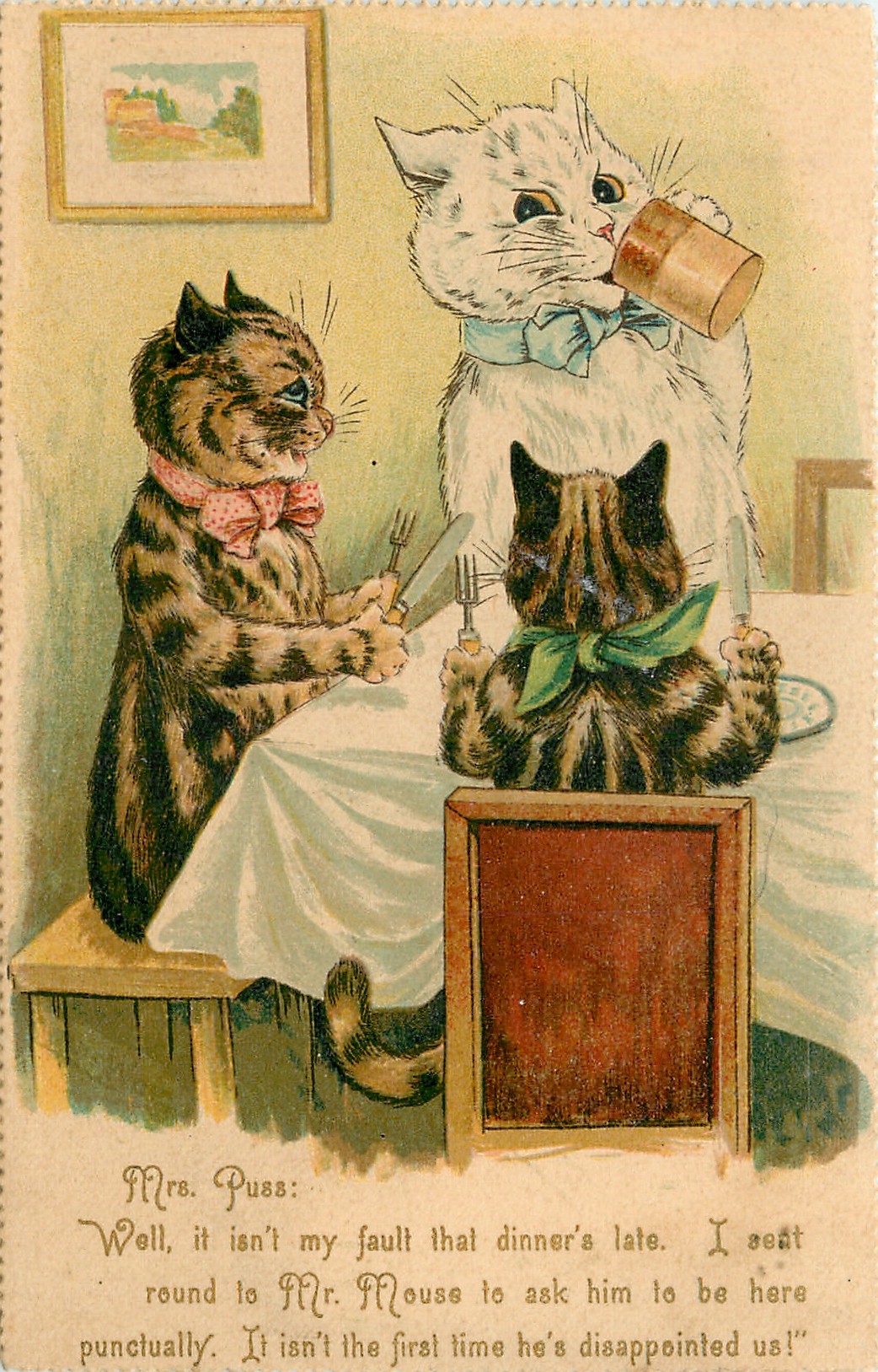 MRS. PUSS: "WELL, IT ISN'T MY FAULT THAT DINNER'S LATE. I SENT ROUND TO MR. MOUSE TO ASK HIM TO BE HERE PUNCTUALLY. IT ISN'T THE FIRST TIME HE'S DISAPOINTED US!"