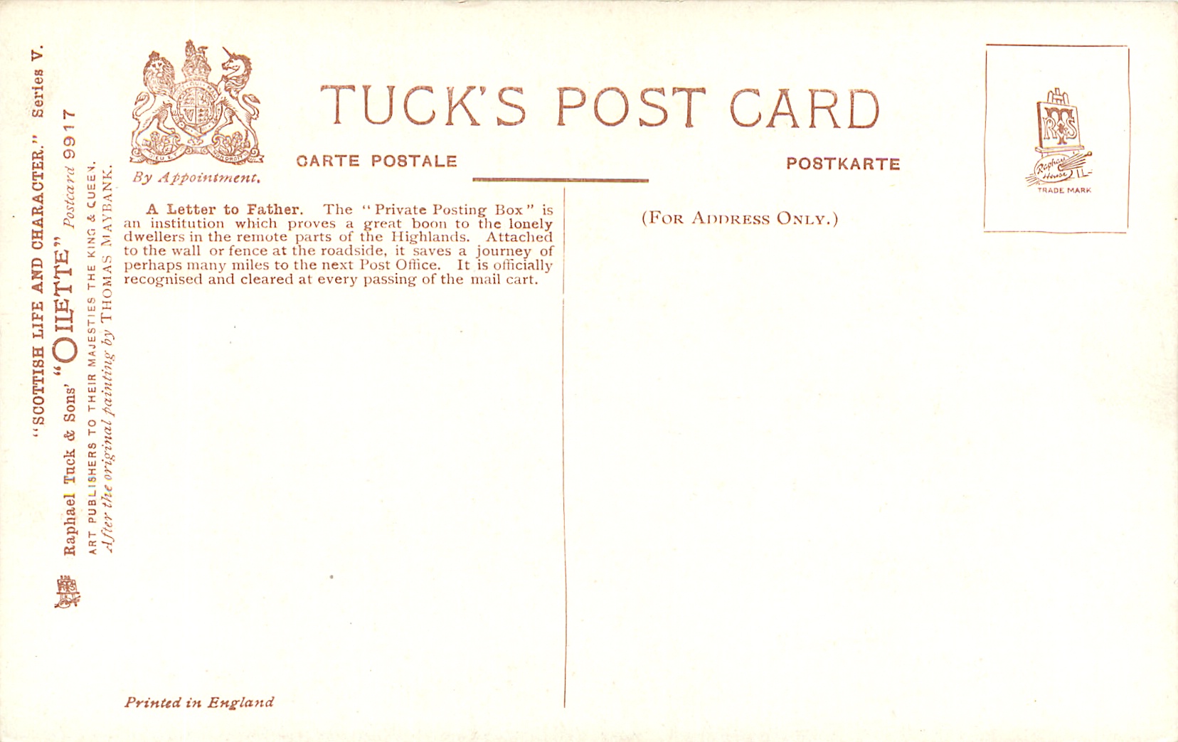 OILETTE, PRINTED IN ENGLAND, AFTER THE ORIGINAL PAINTING BY THOMAS MAYBANK, listed in 11911/1912 & 1913/1914 Postcard Catalogues