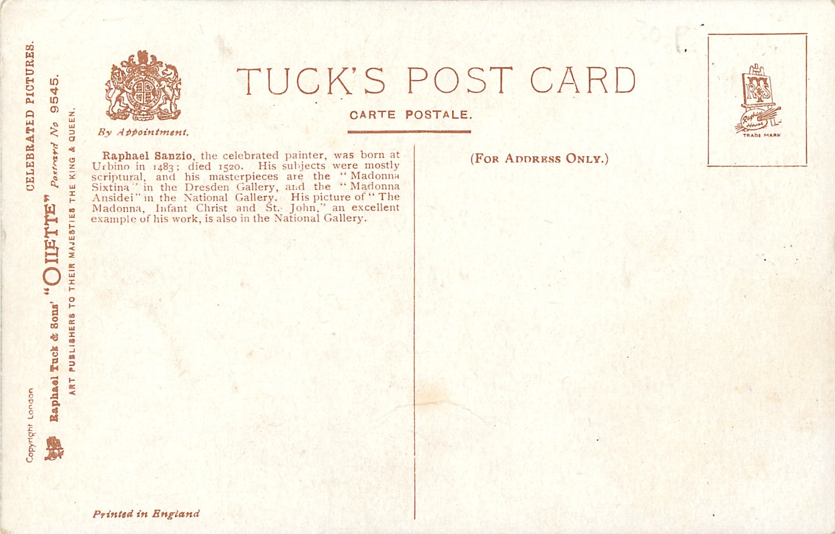OILETTE, PRINTED IN ENGLAND or PROCESSED IN BAVARIA with or w/o COPYRIGHT LONDON, listed as GALLERY PICTURES & as NATIONAL GALLERY in 1908/1909 & 1911/1912 Catalogue, listed as GALLERY PICTURES in 1908/1909 & 1913/1914 Postcard Catalogue, listed in TUCK'S TRAVELOGUES (USA?1905)