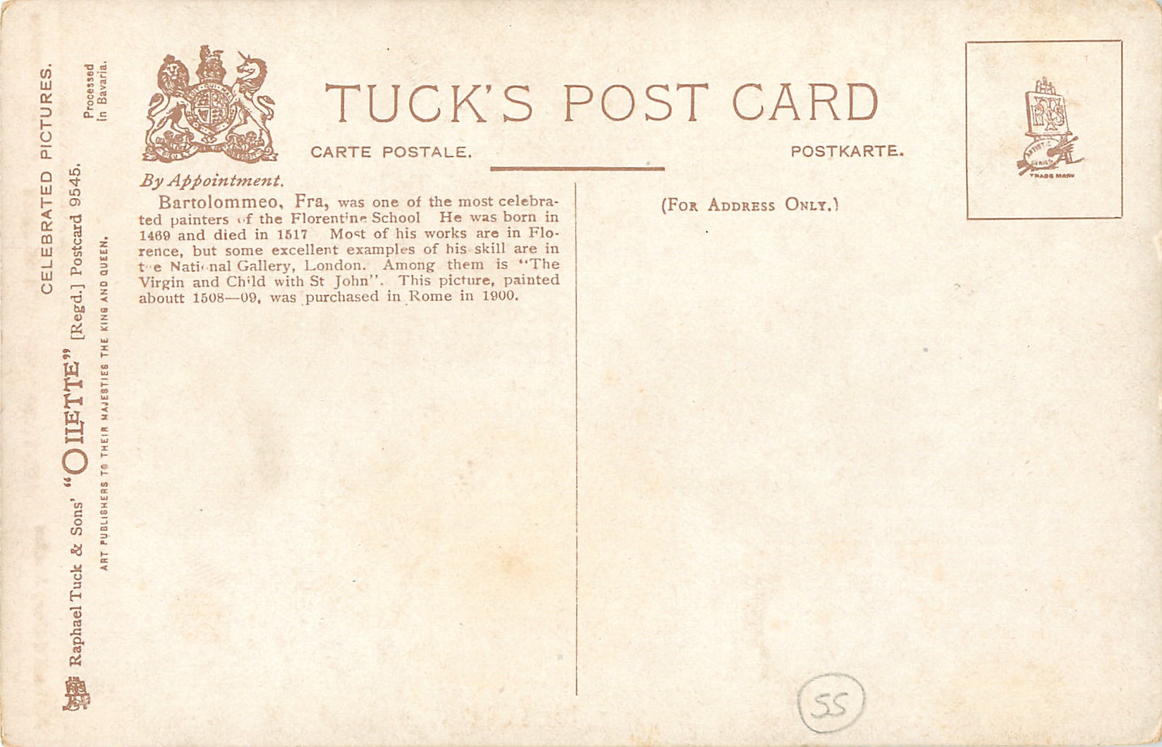 OILETTE, PRINTED IN ENGLAND or PROCESSED IN BAVARIA with or w/o COPYRIGHT LONDON, listed as GALLERY PICTURES & as NATIONAL GALLERY in 1908/1909 & 1911/1912 Catalogue, listed as GALLERY PICTURES in 1908/1909 & 1913/1914 Postcard Catalogue, listed in TUCK'S TRAVELOGUES (USA?1905)