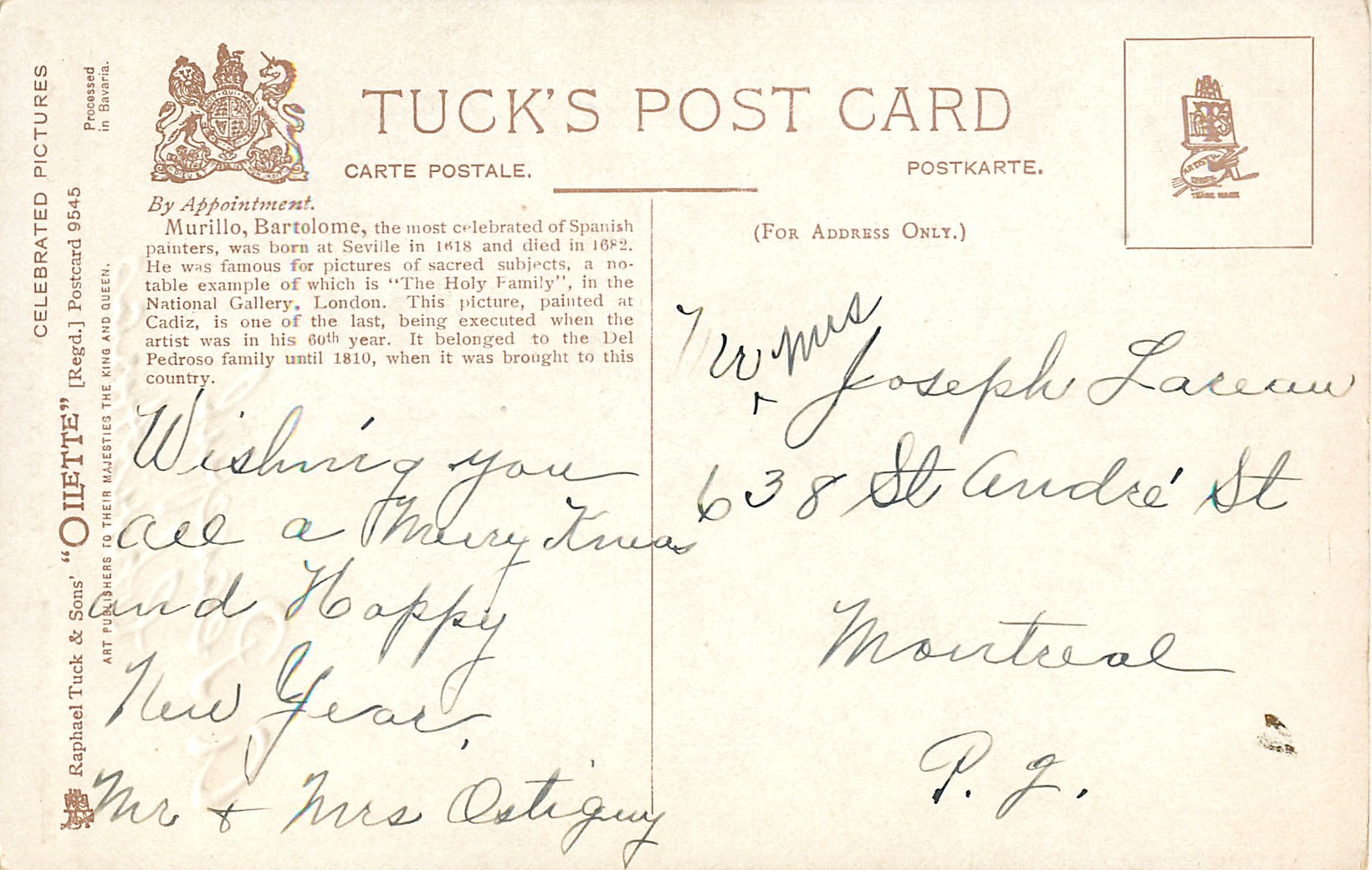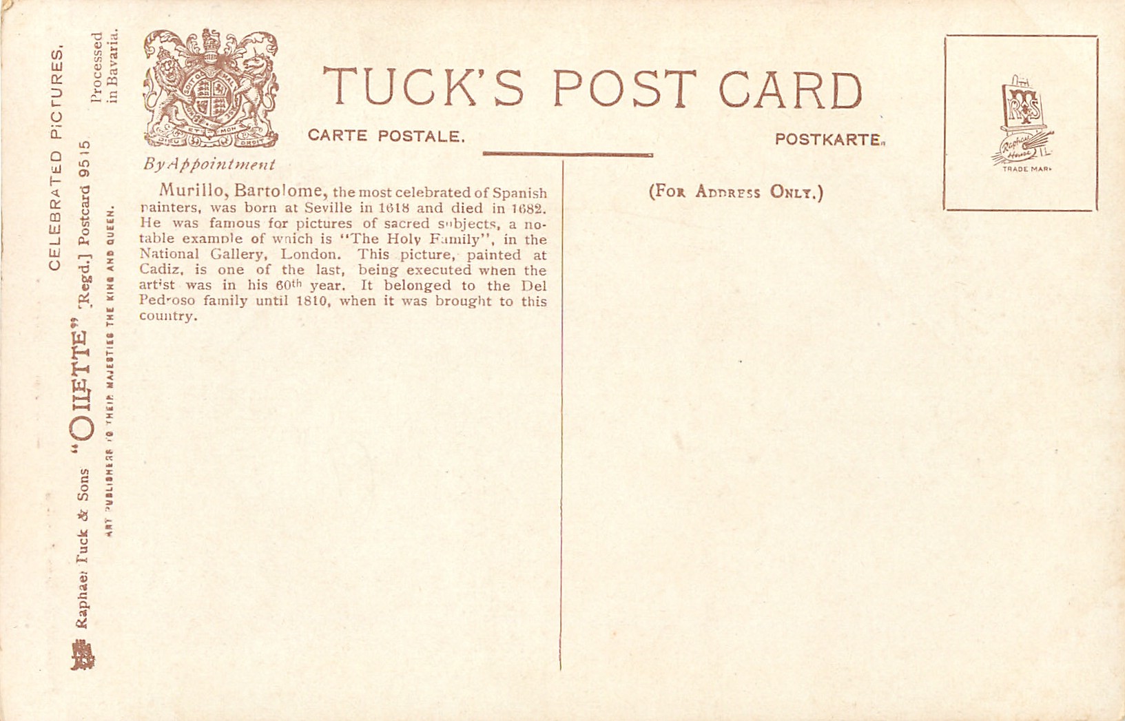 OILETTE, PRINTED IN ENGLAND or PROCESSED IN BAVARIA with or w/o COPYRIGHT LONDON, listed as GALLERY PICTURES & as NATIONAL GALLERY in 1908/1909 & 1911/1912 Catalogue, listed as GALLERY PICTURES in 1908/1909 & 1913/1914 Postcard Catalogue, listed in TUCK'S TRAVELOGUES (USA?1905)