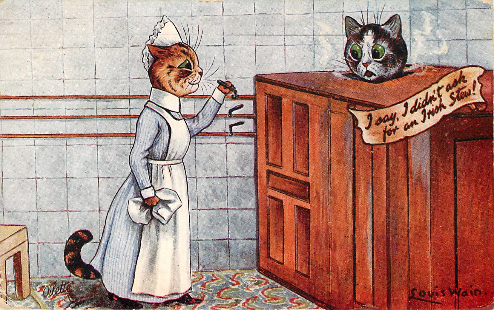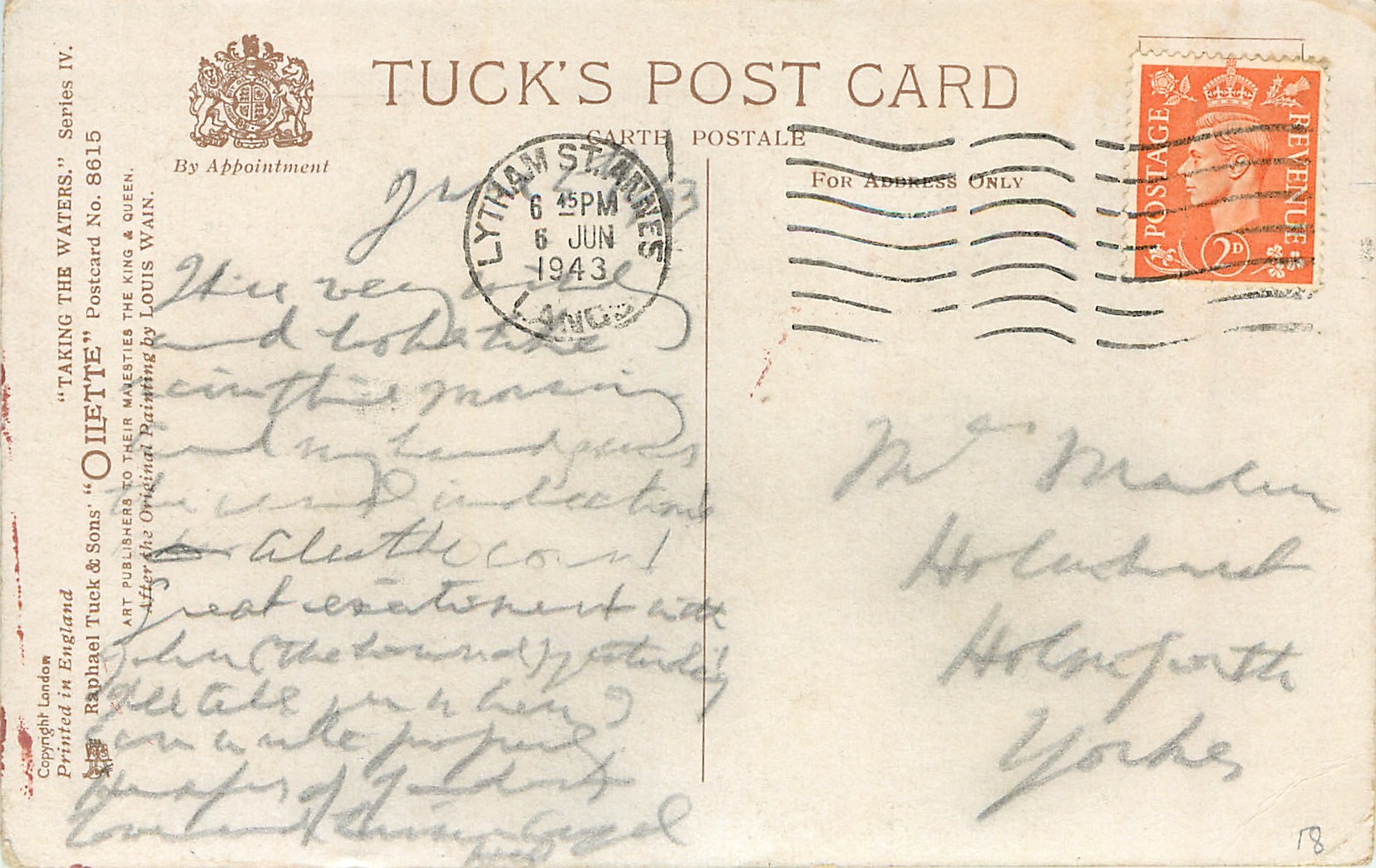 OILETTE, PRINTED IN ENGLAND, with or w/o COPYRIGHT LONDON, title also coms TAKING THE WATERS, see Booth and Lund, listed in 1930 POSTCARD Catalogue
