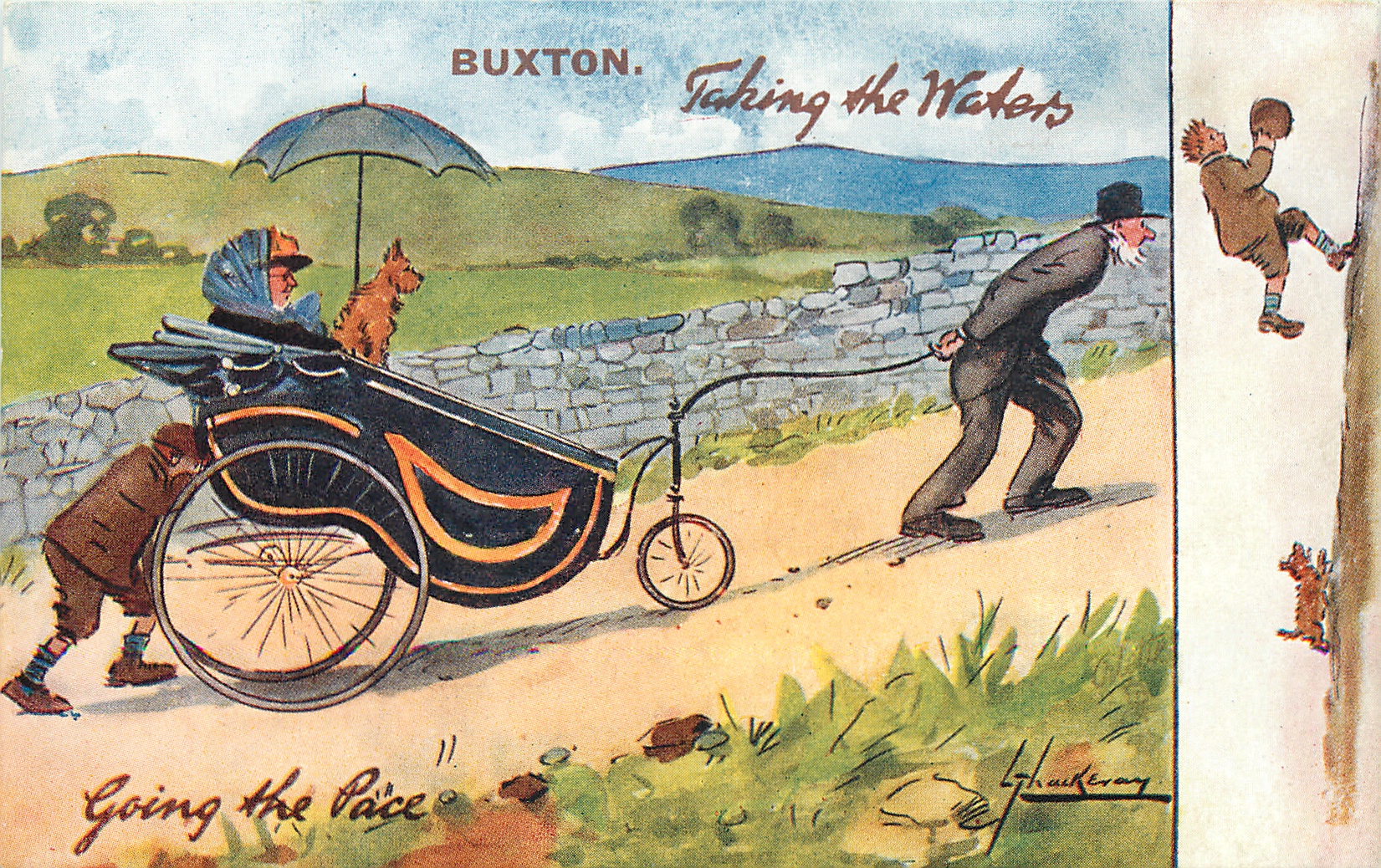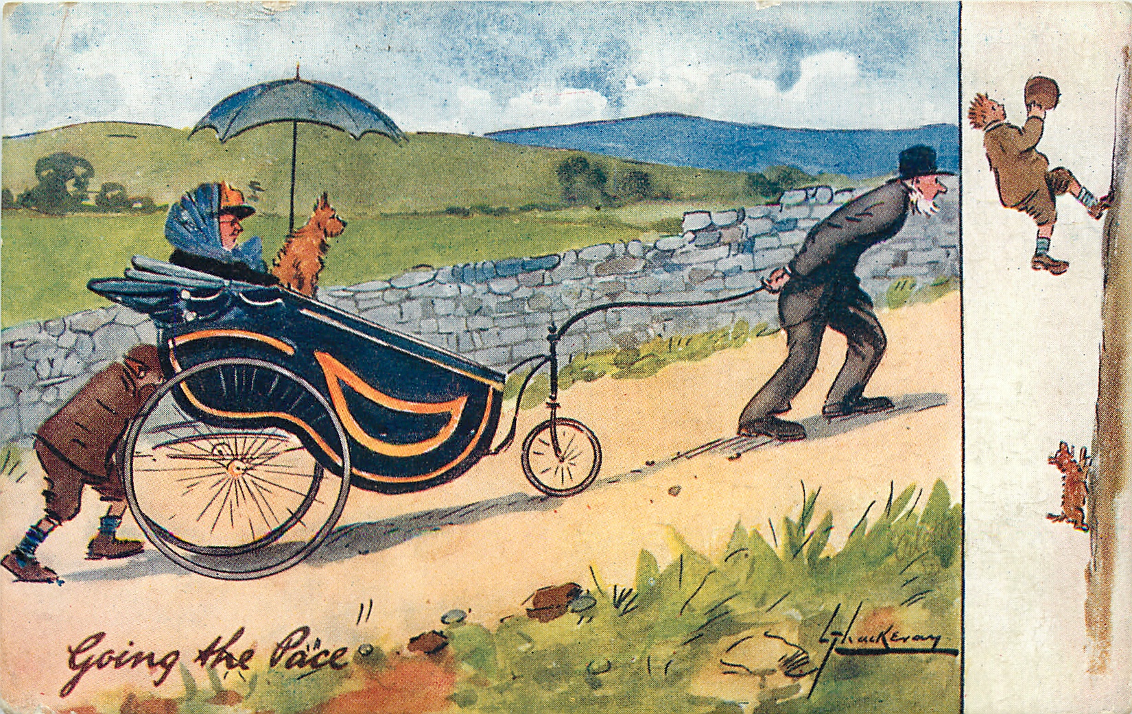 GOING THE PACE elderly man pulls, boy pushes woman & dog in an antique vehicle