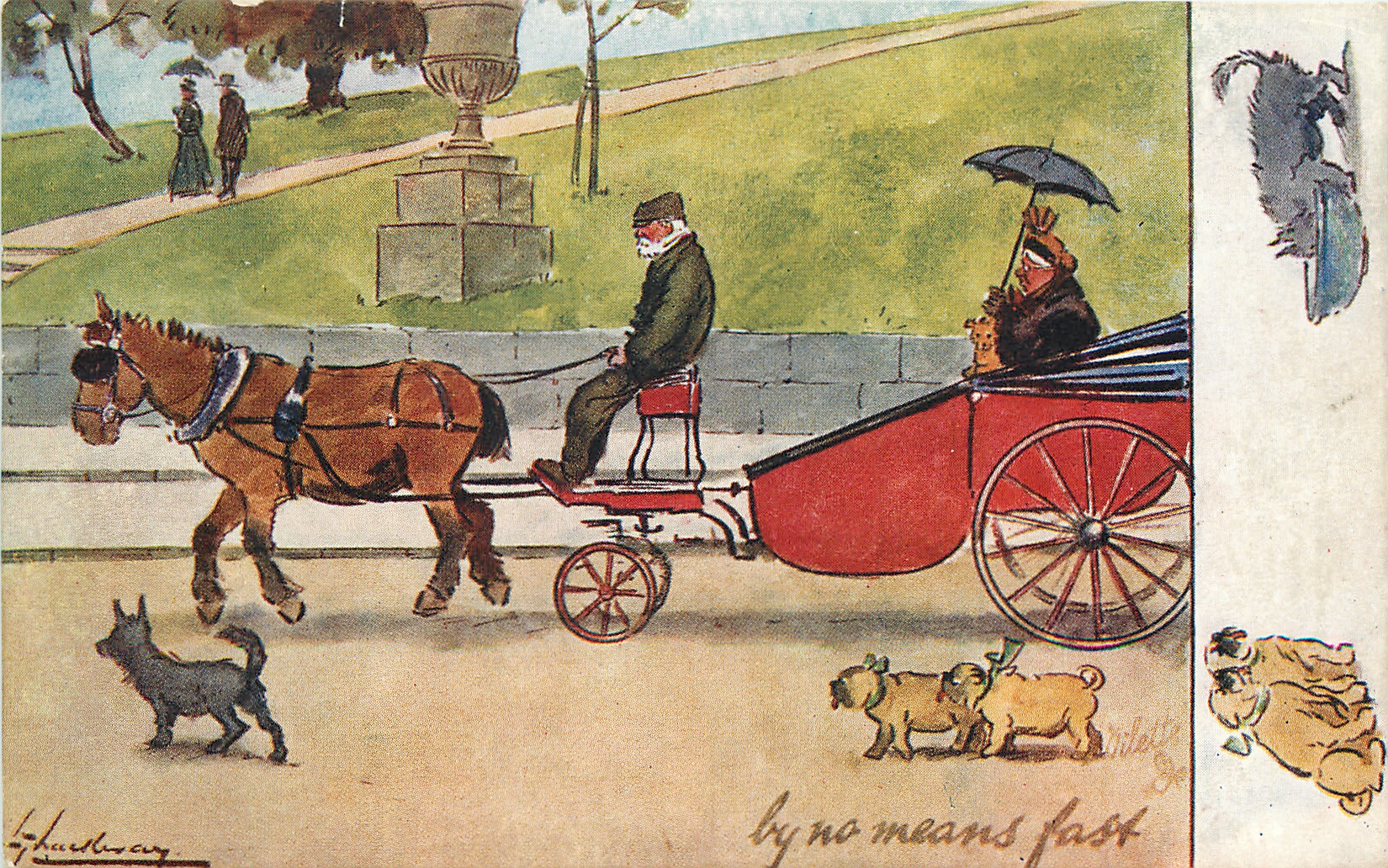BY NO MEANS FAST a slow parade let of elderly lady in open carriage, three dogs accompany