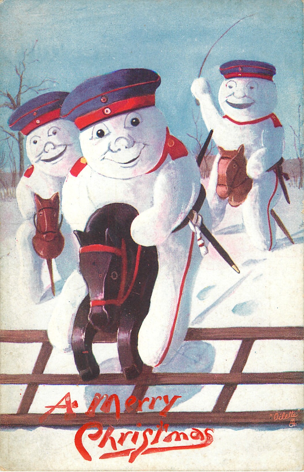 three snowman dressed as German soldiers, each on a wooden horse one jumps a fence