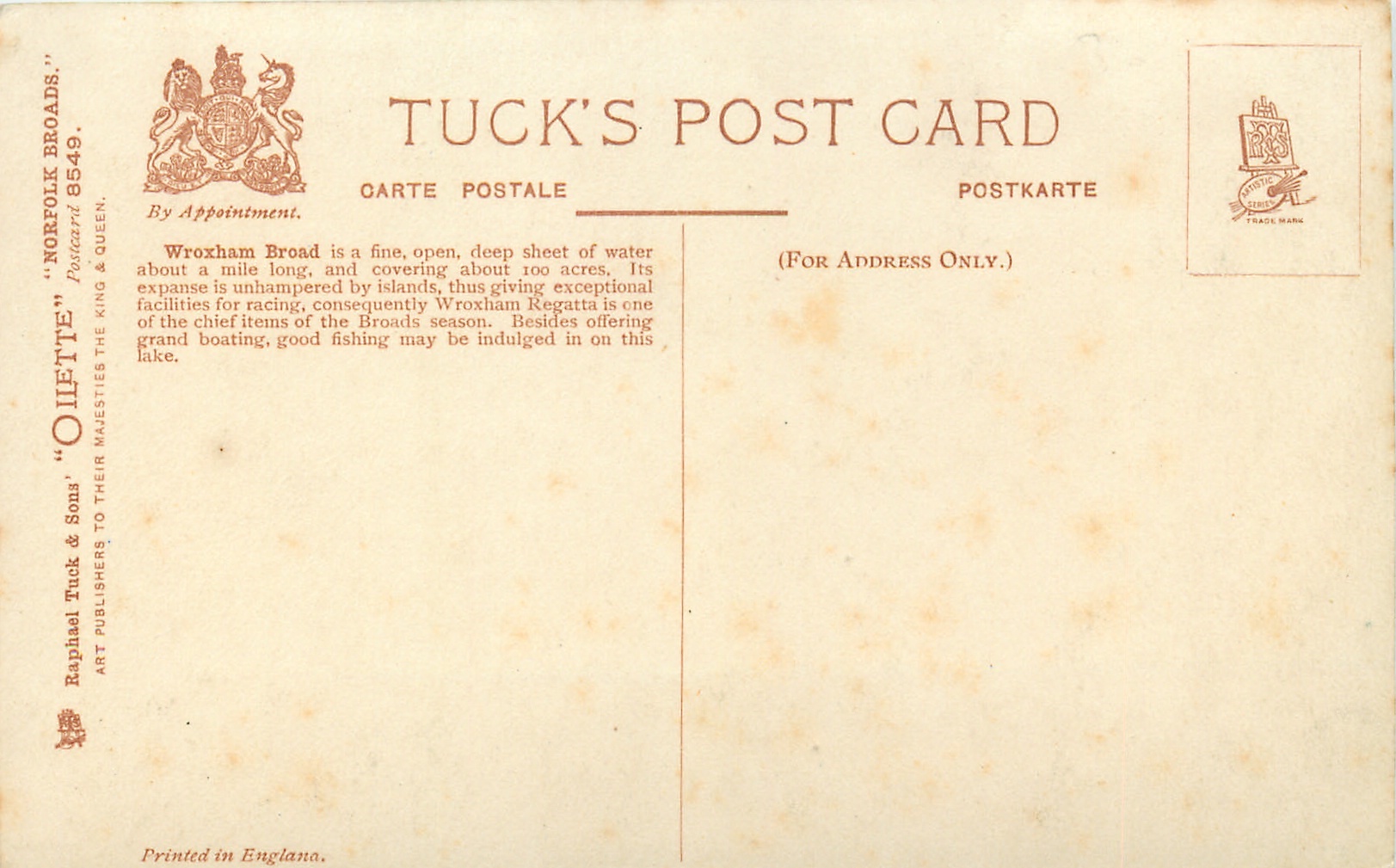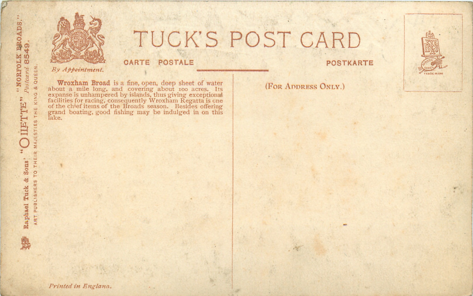 glossy, OILETTE, PRINTED IN ENGLAND, listed in 1908/1909 & 1911/1912 Postcard Catalogue