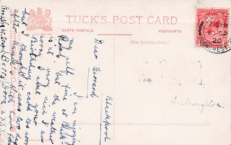 comes crinkled, quote R. SAVAGE, opt. in blue GREETINGS FROM ROCKAWAY BEACH, in red and blue AMERICAN Y.M.C.A., in blue I AM THINKING OF YOU, AT BLACKPOOL.