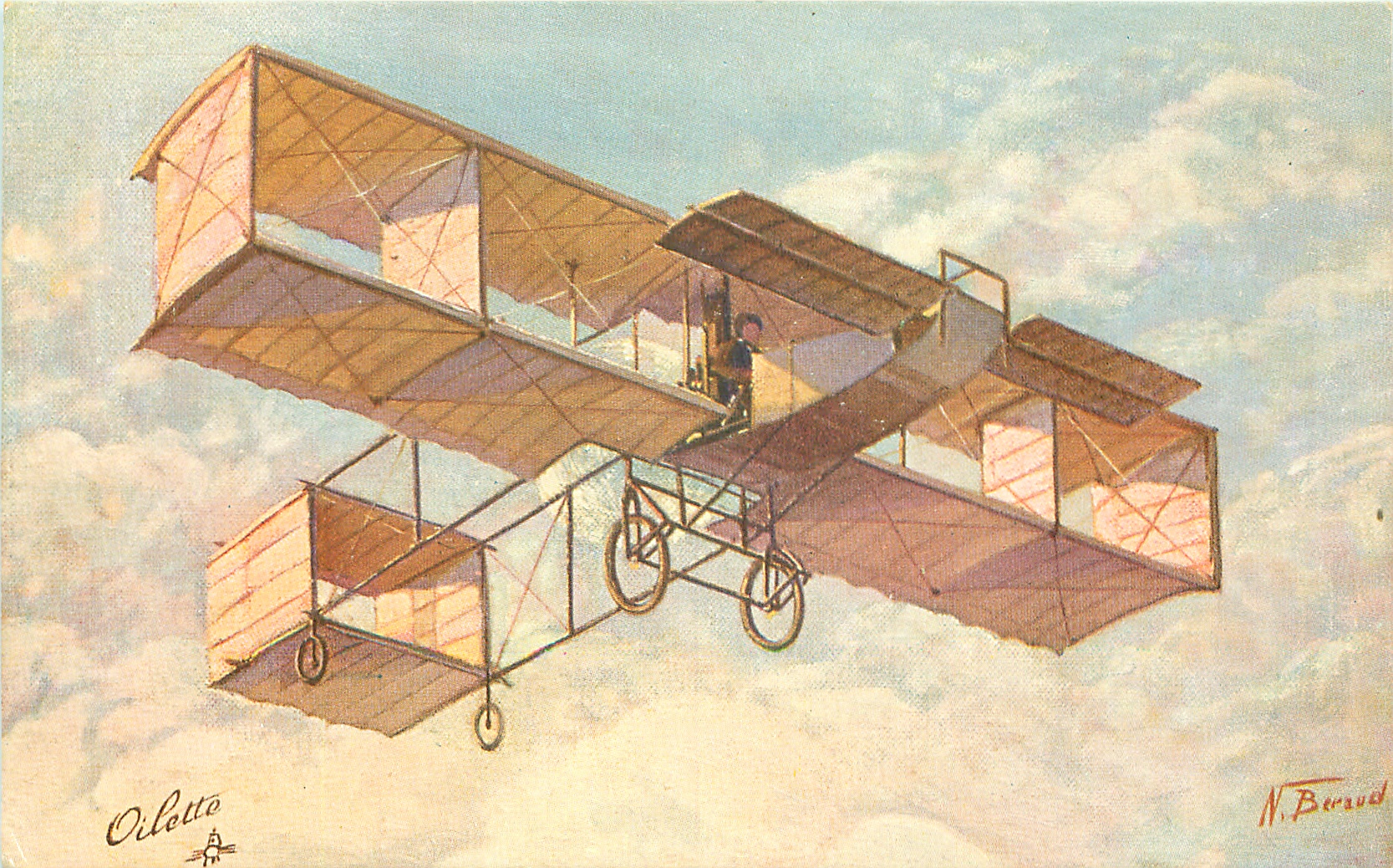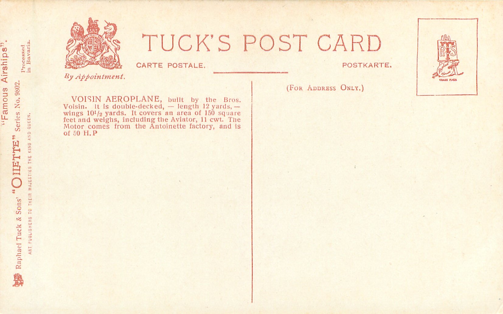 OILETTE, listed in 1911/1912 & 1913/1914 Postcard Catalogues, PROCESSED IN BAVARIA, 2 backs, same image German back 452 OILETTE FLUGMASCHINEN