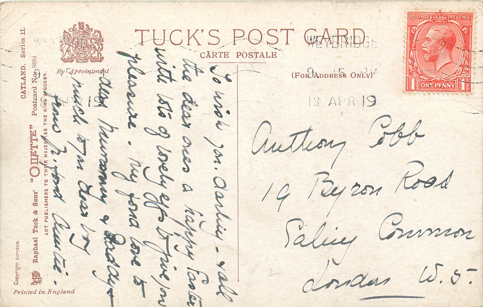 OILETTE, COPYRIGHT LONDON, PRINTED IN ENGLAND or PRINTED IN THE UNITED KINGDOM, come o/f but not so trade named, 3 backs, with or w/o AFTER THE ORIGINAL PAINTING BY B. COBBE., listed in 1926/1927 Postcard catalogue