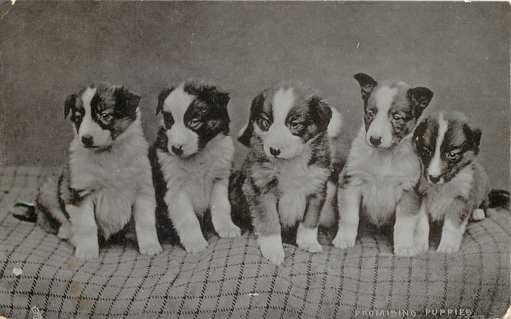 PROMISING PUPPIES five puppies sit in a line