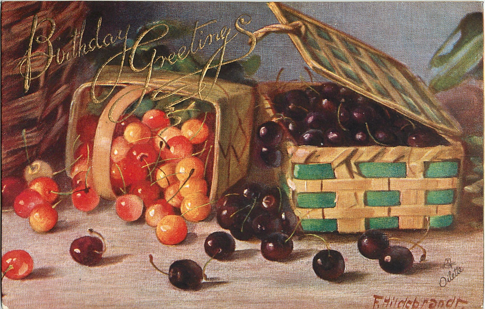 black and red/yellow cherries in two baskets, one on its side spilling cherries