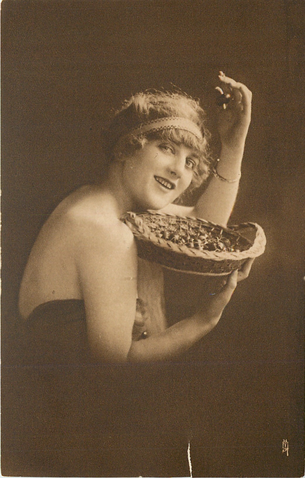 girl in off shoulder dress, band around hair, holds cherries over head left hand, holds basket of cherries under her chin with right hand, faces right, looks forward