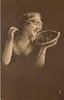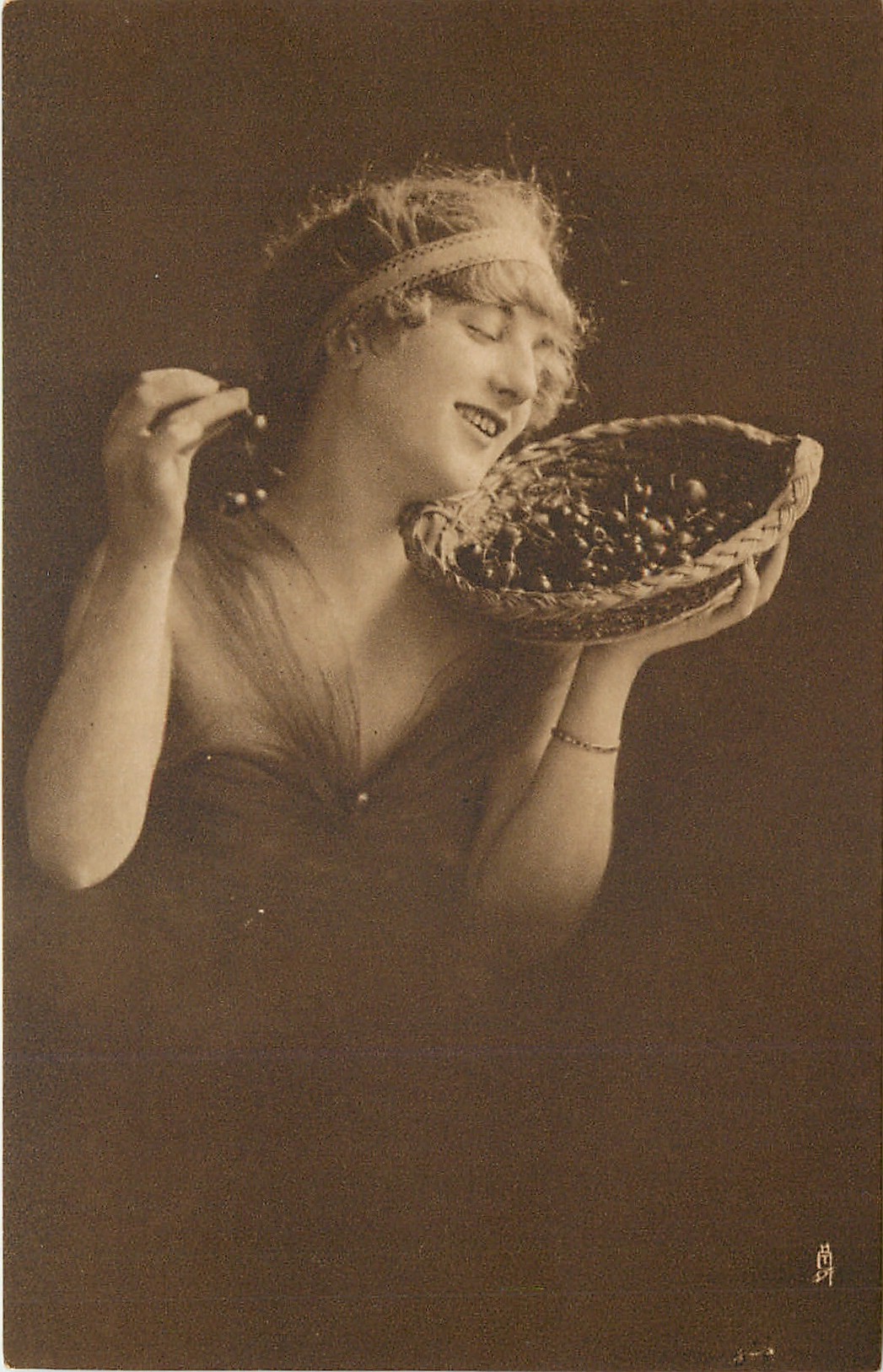 girl in off shoulder dress, band around hair, holds cherries in right hand at neck level, holds basket of cherries under her chin with left hand, looks down into basket