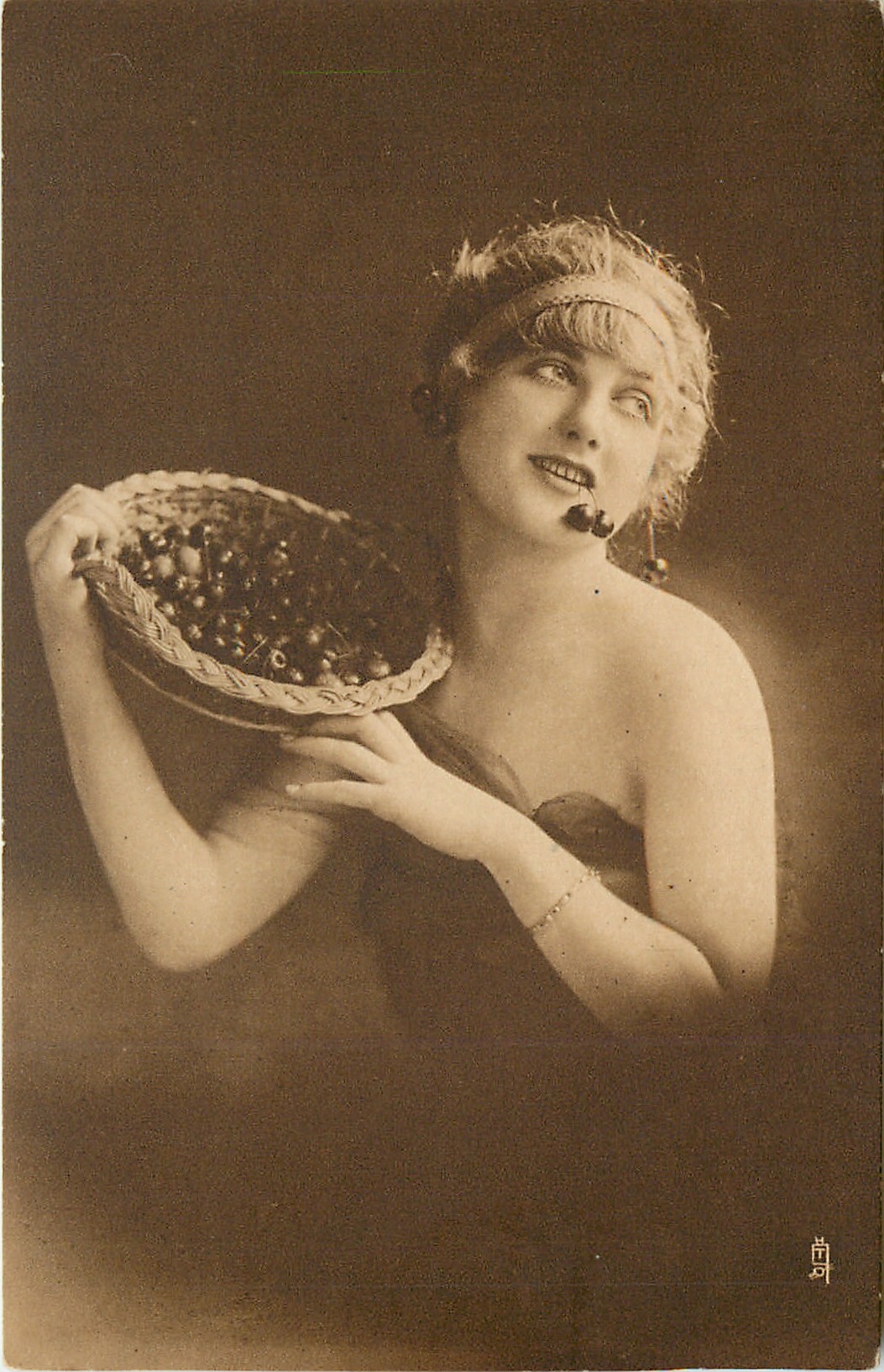 girl in off shoulder dress, band around hair, with cherries in mouth